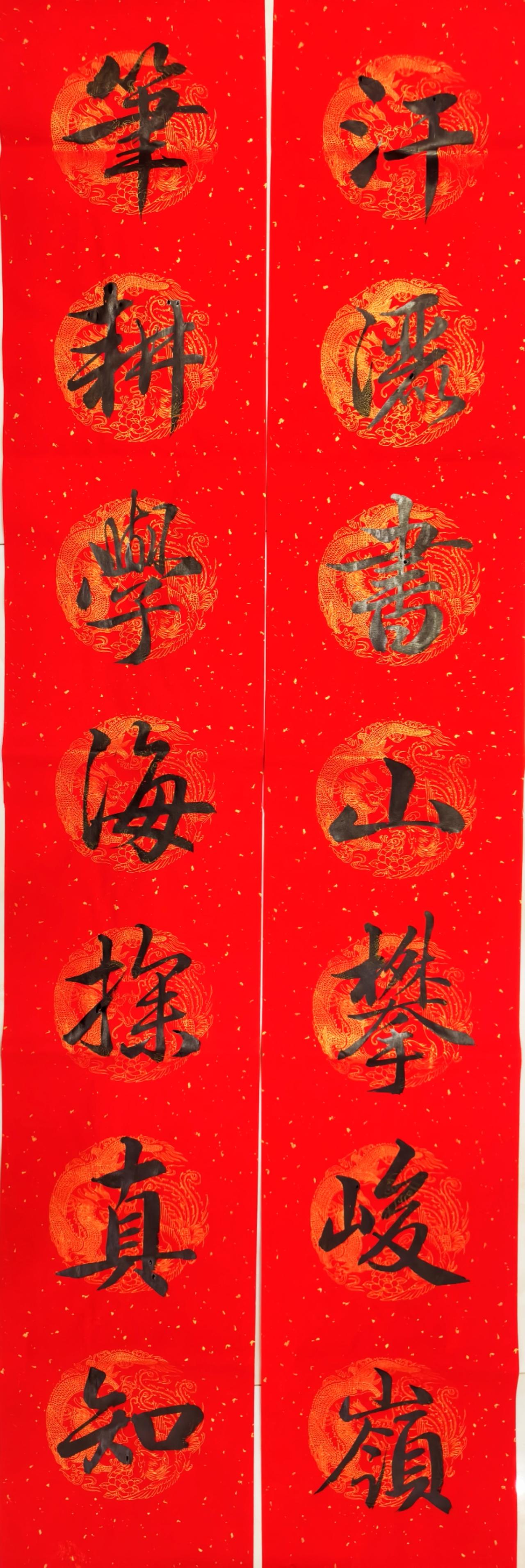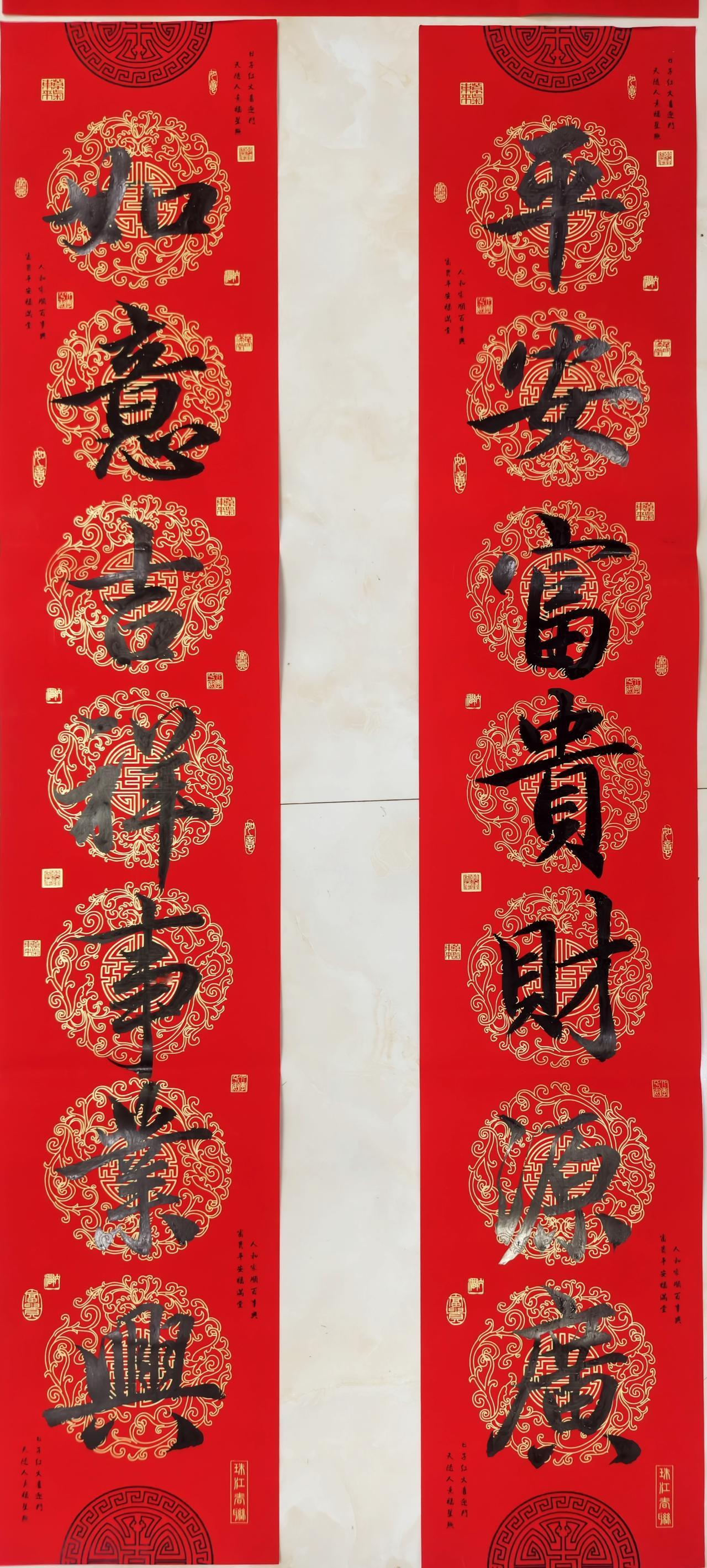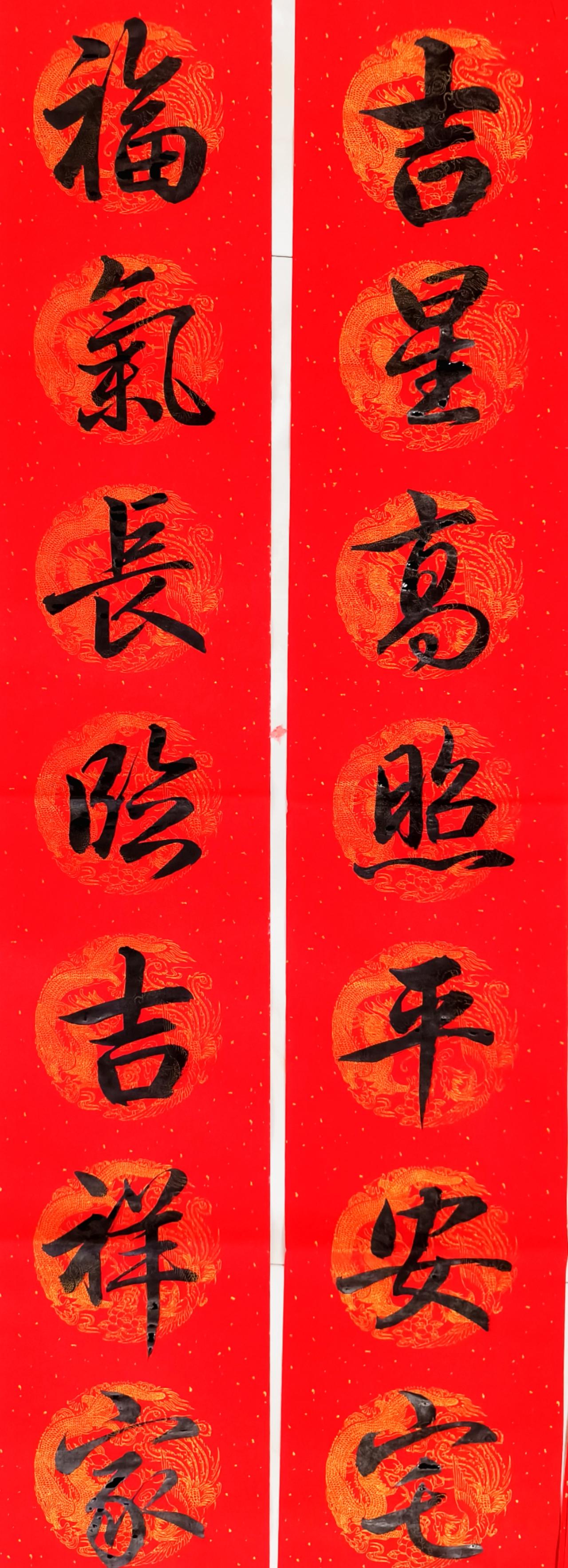 这是我最近写的春联。用AL制作后贴在门上感觉效果还不错。常听人说:“字怕上墙”,字一但贴在墙上,一眼看上去不别扭,说明结构就稳了。春联
