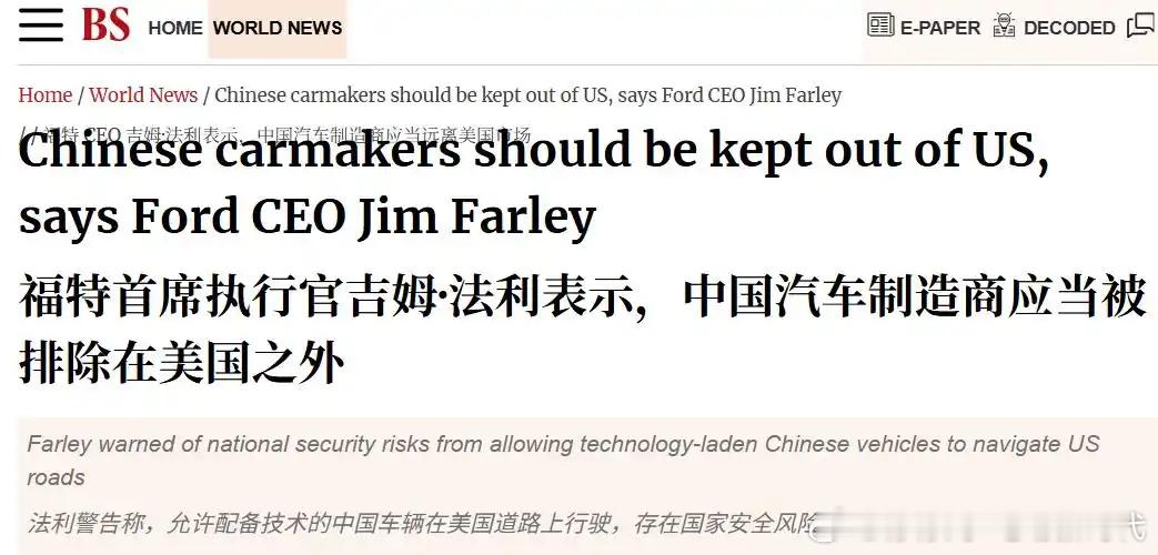 福特CEO坚决反对中国电车进入美国福特CEO称中国电车会给美带来毁灭性打击福特汽车 CEO 吉姆・法利最近在采访里直接摊牌了 —— 中国电动车要是进了美国,本土制造业就得 “完蛋”,还说 “我们不该让它们进来”,甚至直言 “这根本不可能是公平较量”!更绝的是,他在 4 月 13 日福克斯新闻的采访里还爆了个猛料:中国汽车年产能超 5000 万辆,足够覆盖美国所有制造需求和全部市场销量!要知道美国 2025 年新车才卖了 1600 多万辆,这产能差距简直是降维打击啊!这已经不是法利第一次慌了,他之前就多次把中国品牌形容成美国车企的 “生死存亡级威胁”。但最讽刺的是 —— 这位天天喊着要封杀中国车的 CEO,自己开了半年小米 SU7 还舍不得换,嘴上说不要,身体却很诚实嘛!一边是传统车企的焦虑,一边是中国电动车的强势崛起。你觉得中国品牌真能横扫美国市场吗?法利这波是真害怕了还是在卖惨求保护?快来评论区聊聊!