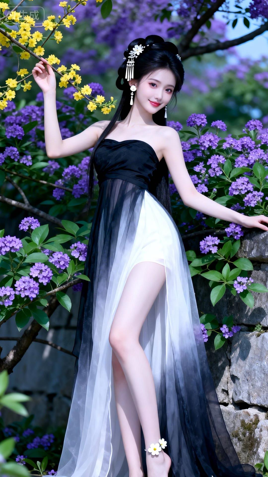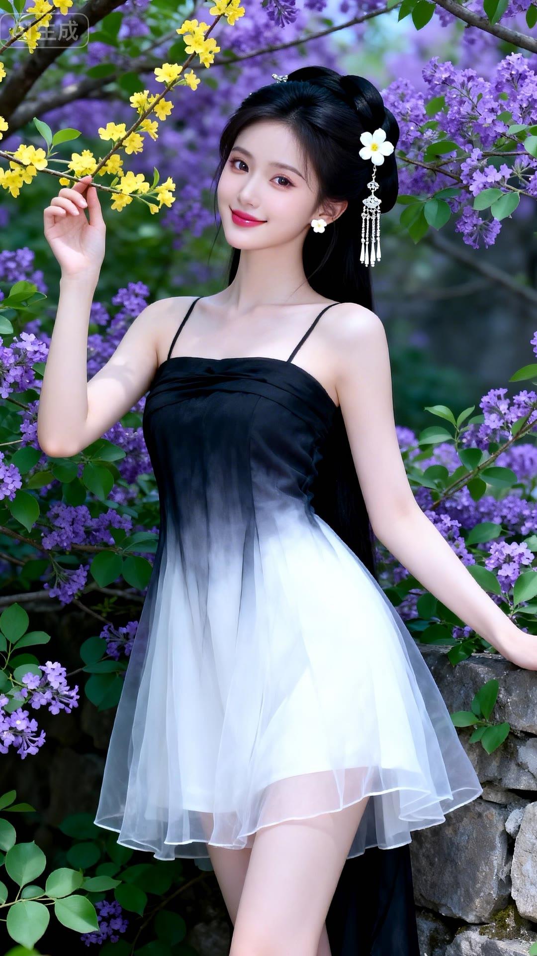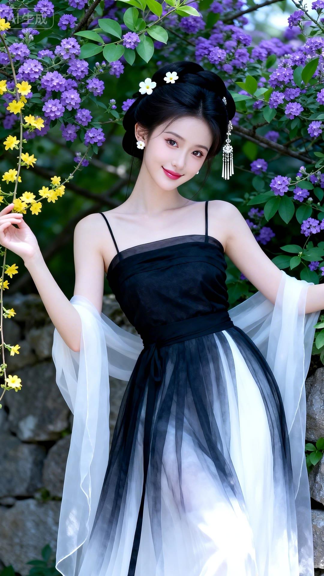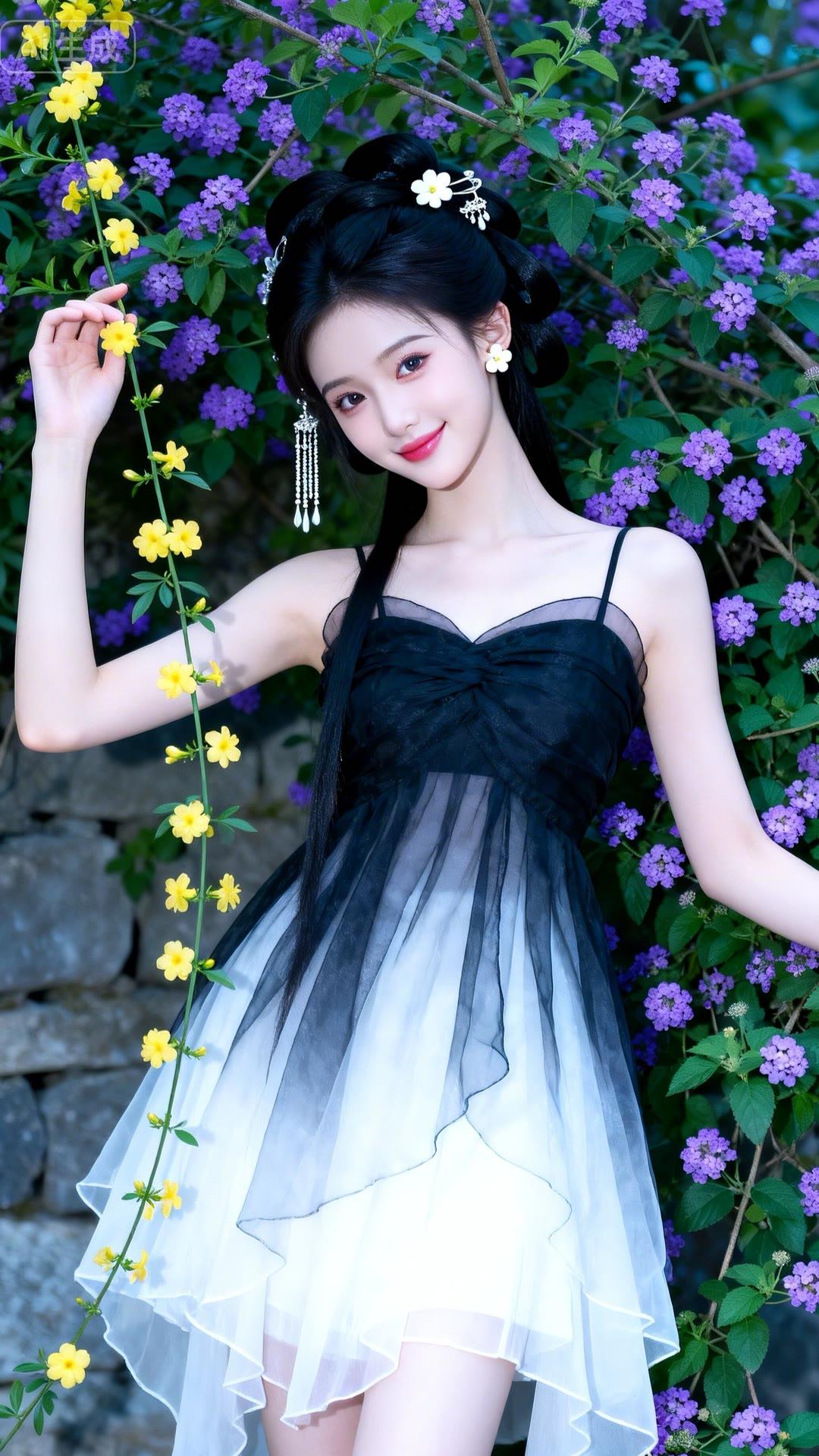 黑纱裙少女与花海,梦幻仙境的浪漫邂逅
