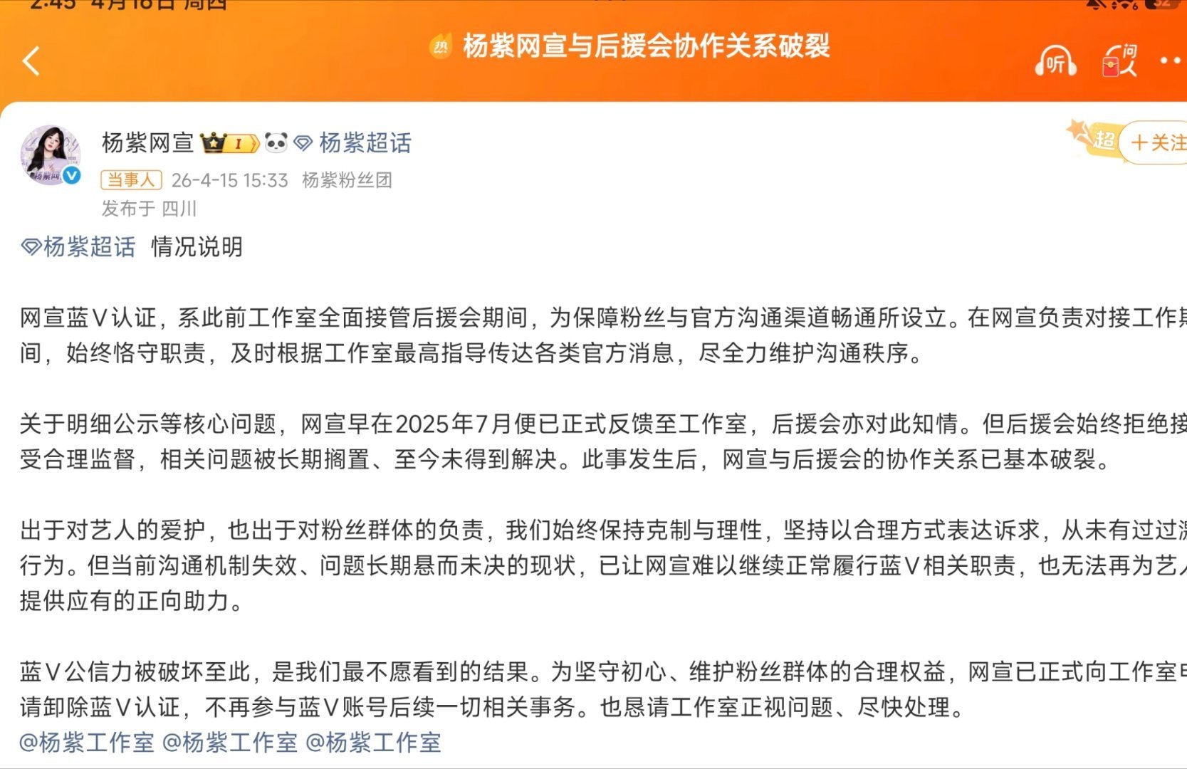 后援会向杨紫和紫米们道歉杨紫后援会宣布集体辞职解散重组,并向杨紫及粉丝致歉,你觉