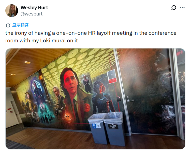 昨天新闻报道迪士尼进行大裁员,炒了超过1000名员工。随后漫威影业资深概念设计师 Wesley Burt 在推上表示他也被HR“约谈”,暗示已经被“优化”。讽刺的是,迪士尼HR约谈他时,办公室背景墙的洛基艺术图就是他画的。
