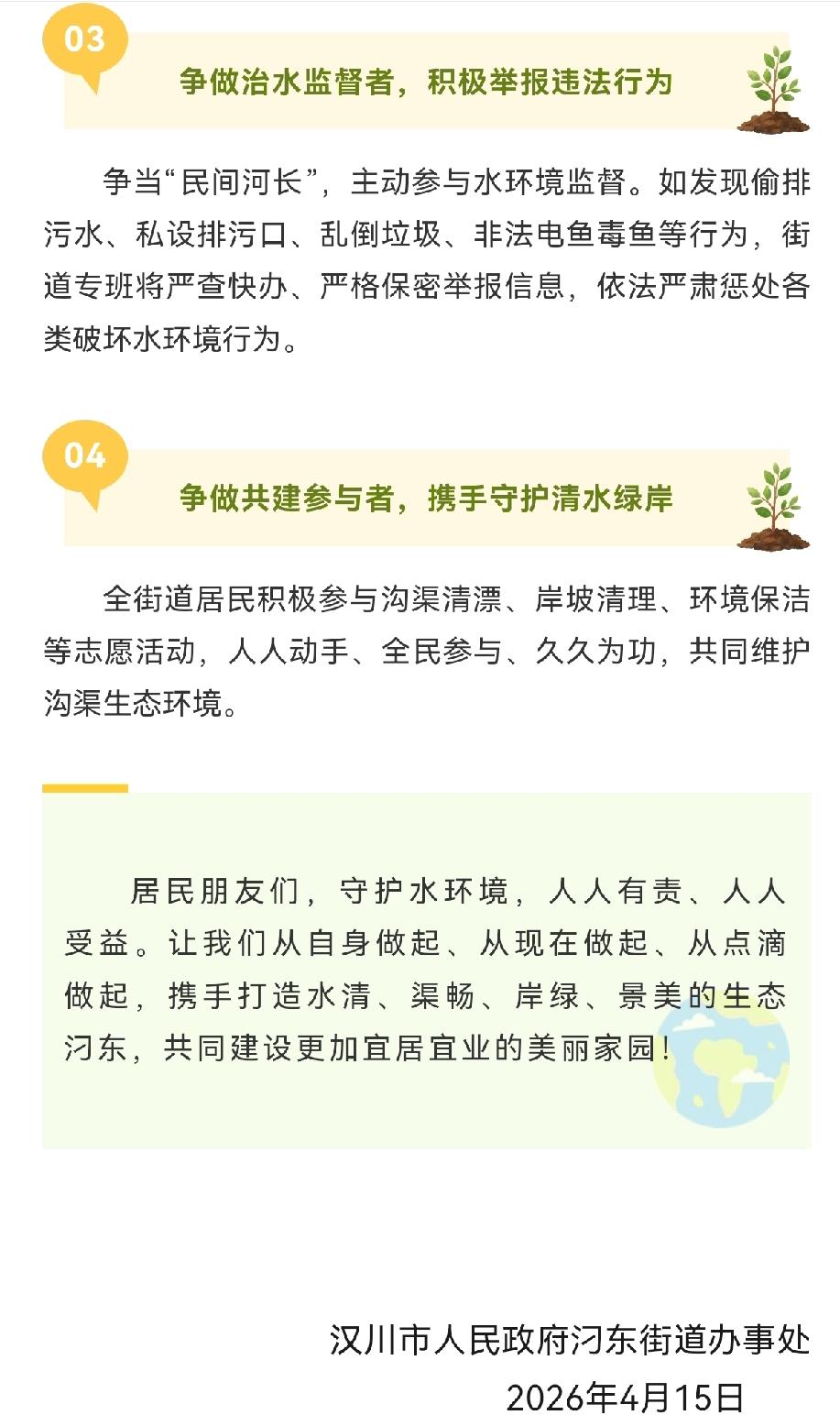 汈东街道广大居民朋友们: 沟渠是城乡生态的“毛细血管”,水清岸绿是我们共同的家园期盼。为认真落实孝感市“千渠万沟”清洁行动部署,持续改善辖区水环境质量,全面修复沟渠生态功能,街道党工委、办事处决定在全街道开展沟渠清洁整治专项行动,现向全体居民发出如下倡议: