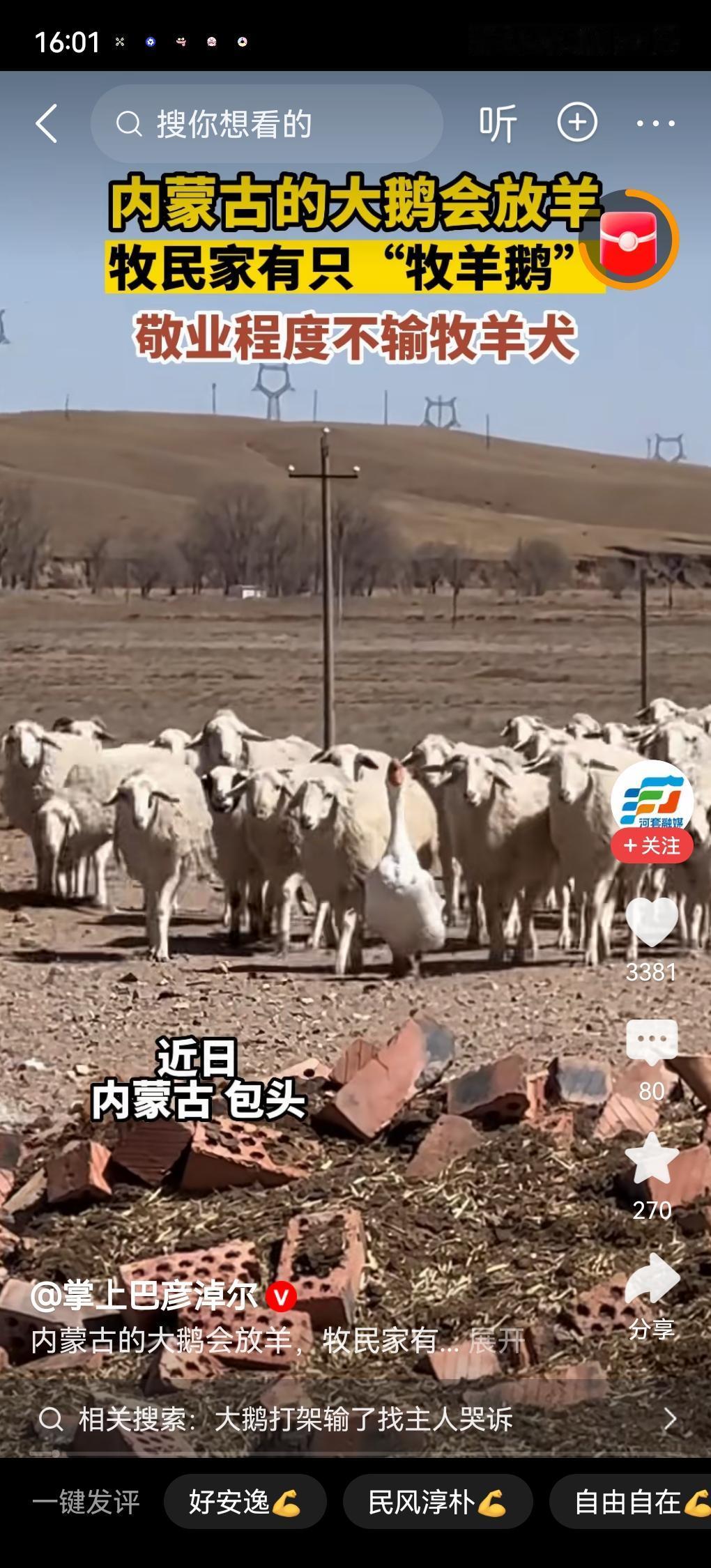 内蒙古一男子,因家中2只大鹅总打架,便把其中一只放在羊圈喂养,谁知,这大鹅竟然帮着管理100多只羊,每天领羊出去又带羊回来,来去十几公里路途,没出过半点岔子。网友:这只鹅算是活明白了!