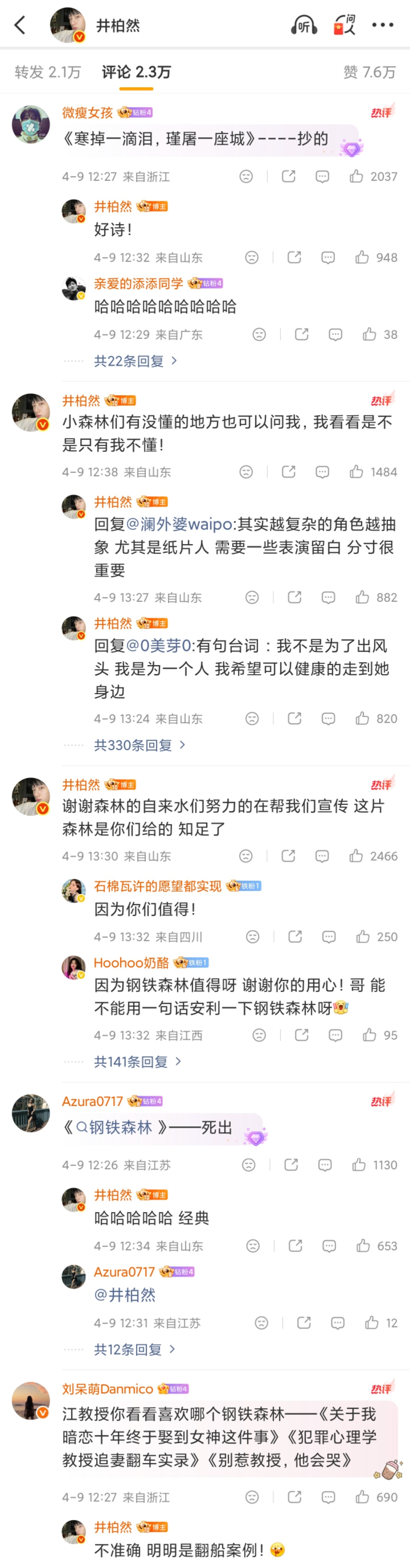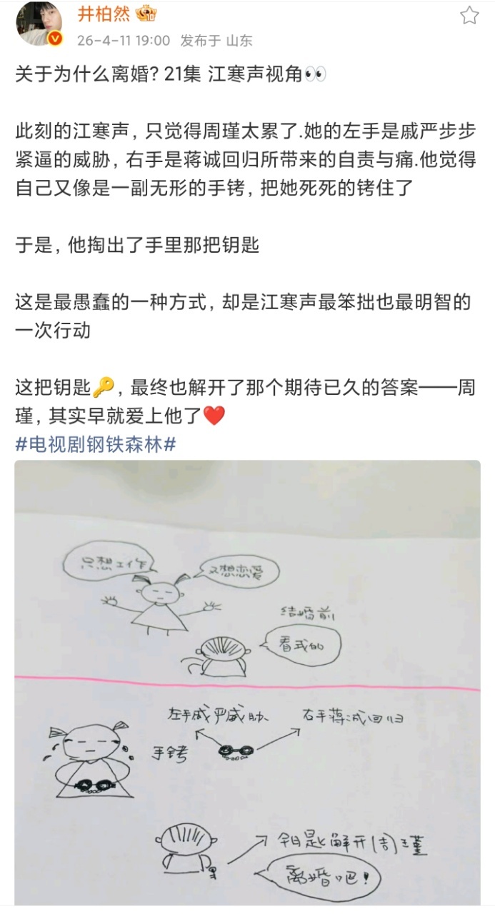钢铁森林为什么能火 天呐,内娱竟然还有这么用心的主创吗?《钢铁森林》不仅男主井柏然手绘画解释江寒声为什么向周瑾提离婚,女主蔡文静也说为了周瑾这个角色立得住,井柏然跟导演、和她一起讨论增加这个角色的魅力点,于是有了出圈打戏...这么友爱和谐的剧组氛围好像回到了以前,内娱主创还有别人这么卷吗?