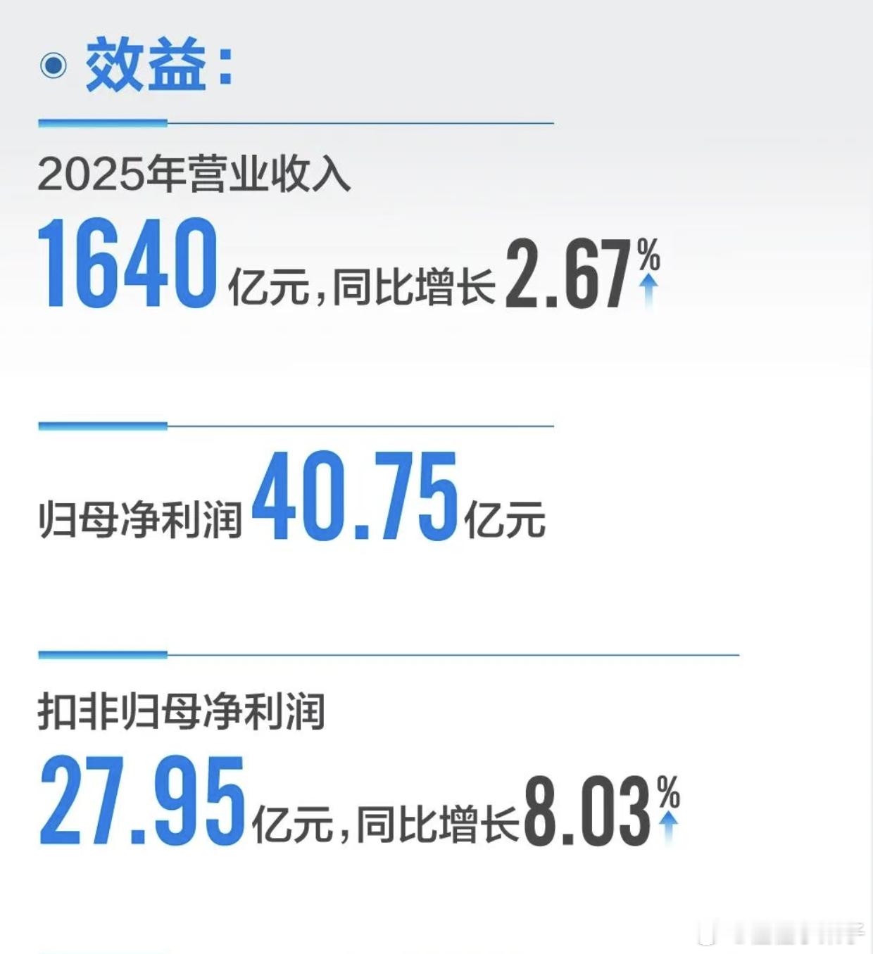 长安汽车发布了2025年年报。公司2025年实现营业收入1640亿元,同比增长2.67%,归母净利润40.8亿元,扣非后归母净利润28.0亿元,同比增长8.03%。