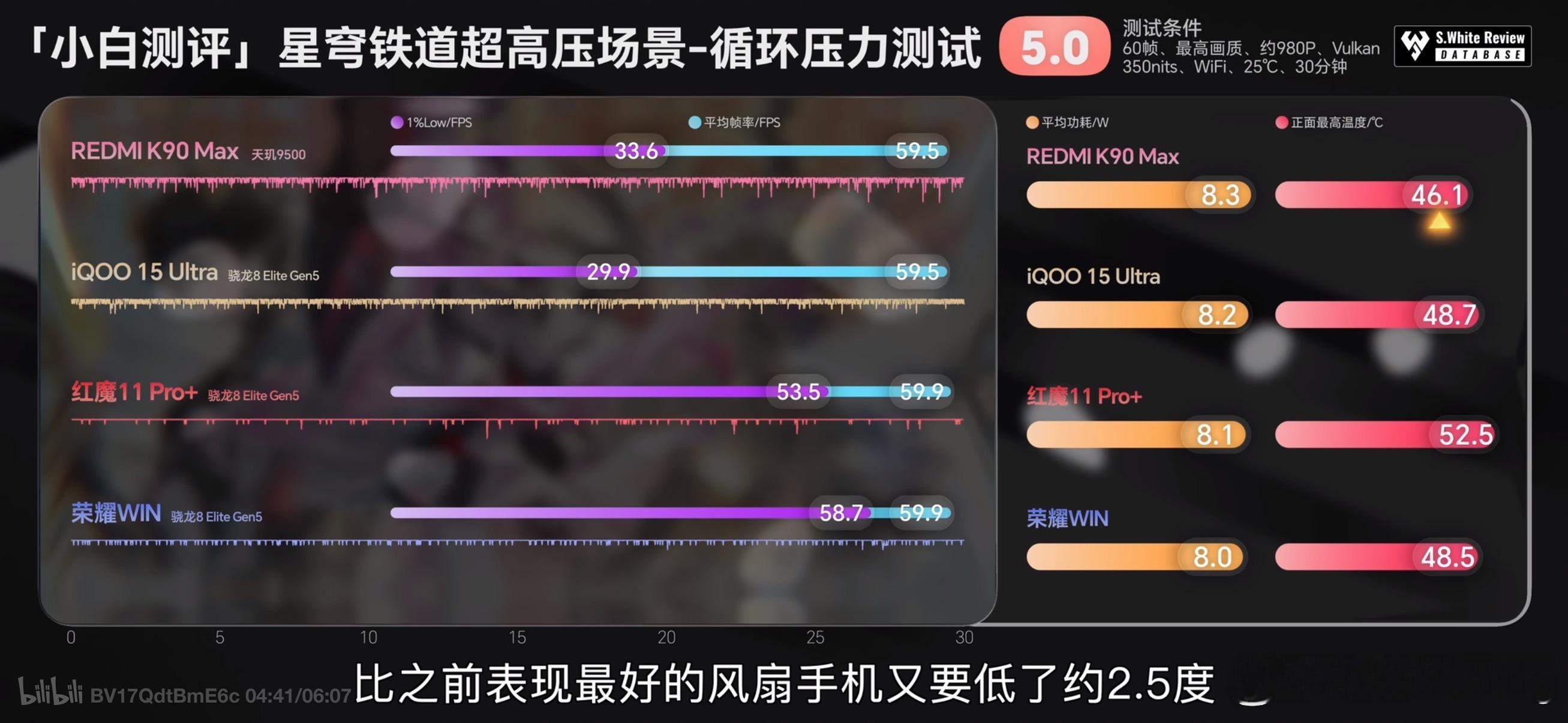 虽然客观来说天玑9500在游戏中的能耗表现会略逊于骁龙8E5,但是在K90 Max的解热能力加持下,这台手机的游戏实测表现能做到不逊于8E5性能标杆。