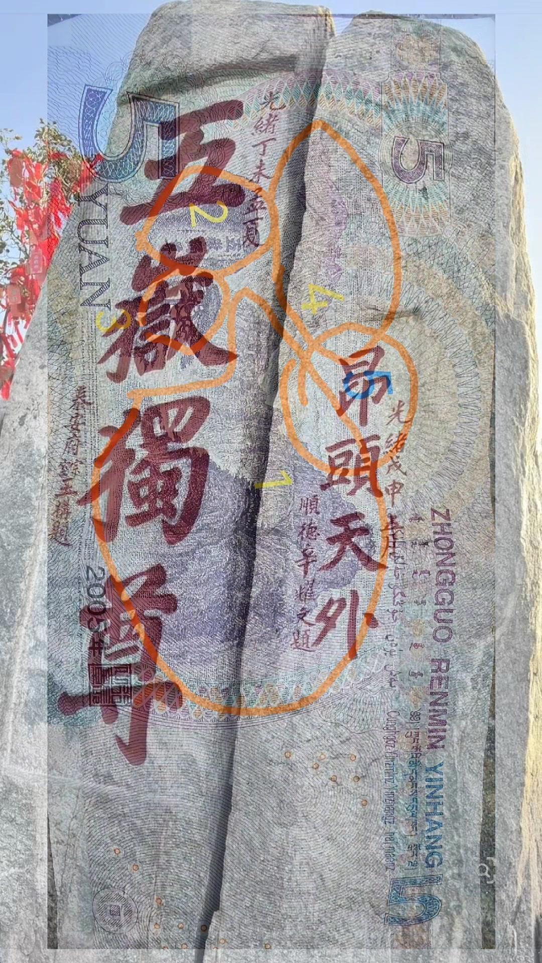 "五岳独尊"四字融合了颜体的雄浑与欧体的险峻,历经百年风雨,已成为泰山的视觉标志和中华精神的硬核象征。如今第五套人民币五元纸币的背面,正是以这块石刻为核心图案,象征着国泰民安。