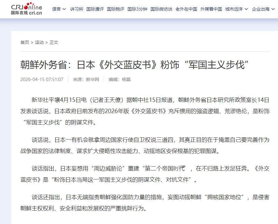 4月15日,朝中社发了条消息,朝鲜外交部日本研究所直接怒批日本刚出的2026年版《外交蓝皮书》,说这份文件全是强盗逻辑,荒唐得没边,就是用来粉饰日本走军国主义老路的阴谋文件。
