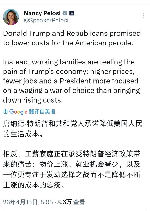 4月15号佩洛西发文骂特朗普,说特朗普和共和党当初拍着胸脯说要给老百姓降生活成本,结果全是空话,反倒让靠打工过日子的家庭遭了罪——物价一个劲往上窜,工作越来越难找,特朗普自己还只顾着搞争斗,压根不管老百姓的死活。