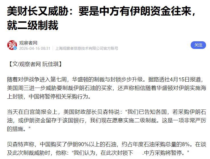 美国财政部长贝森特在白宫放话,只要中国敢买伊朗石油,或者伊朗的钱存在中国银行,就对中国搞二级制裁,还吹牛皮说这措施特别严。