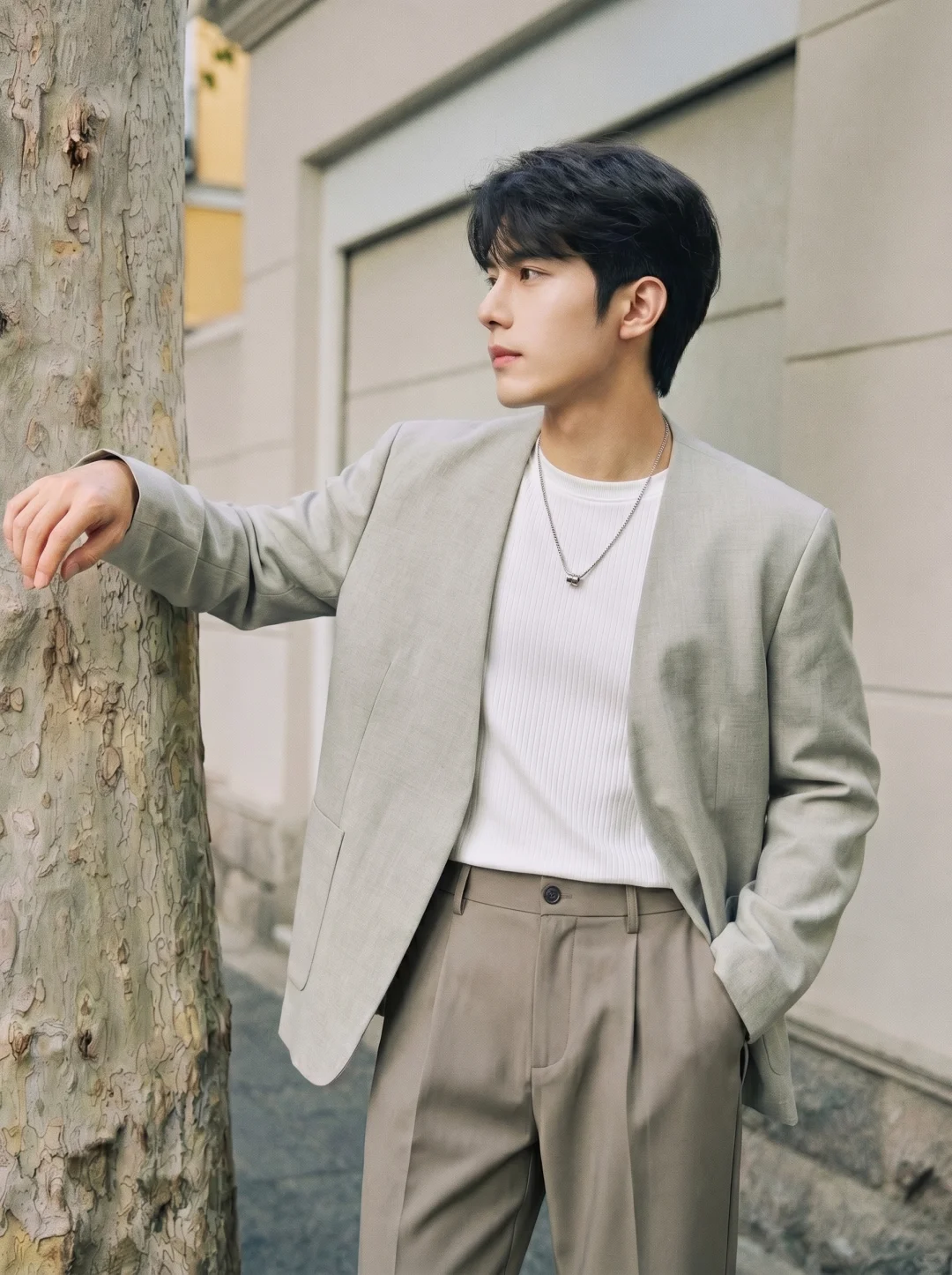 作为常年死磕版型和面料的男装主理人,我发现到了春夏交替,很多男生都有个穿搭痛点:穿常规西装去通勤,总觉得太紧绷、太严肃,稍微出点汗背上就闷得慌,整个人散发着生硬死板的“班味”。🤦♂️想要在25℃的街头保持高级感?我的破局方案是:脱掉翻领,换上这件极简无领亚麻西服,微风吹过,亚麻面料自带的透气感让背部非常干爽,完全没有传统外套那种裹在身上的束缚感☕️ 它的精髓,就在于高级的“做减法”: