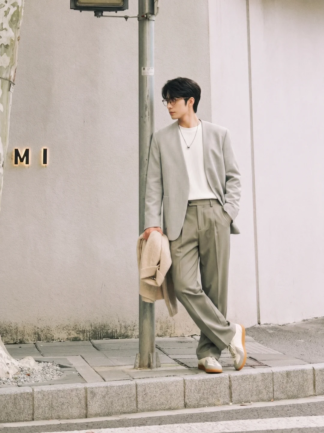 ✨ 领口留白:无扣无领的设计,视觉上直接拉长颈部线条。内搭一件干练的纯白T恤,不用费力凹造型,那种骨子里的“松弛感”就出来了。 ✨ 垂坠随性:下半身我搭配了同色系的直筒休闲西裤。自然的垂坠感不仅能修饰腿型,更是将老钱风的慵懒气质拿捏得刚刚好。🚶♂️