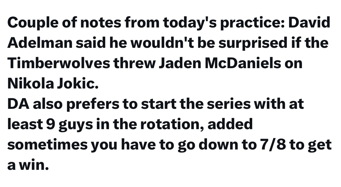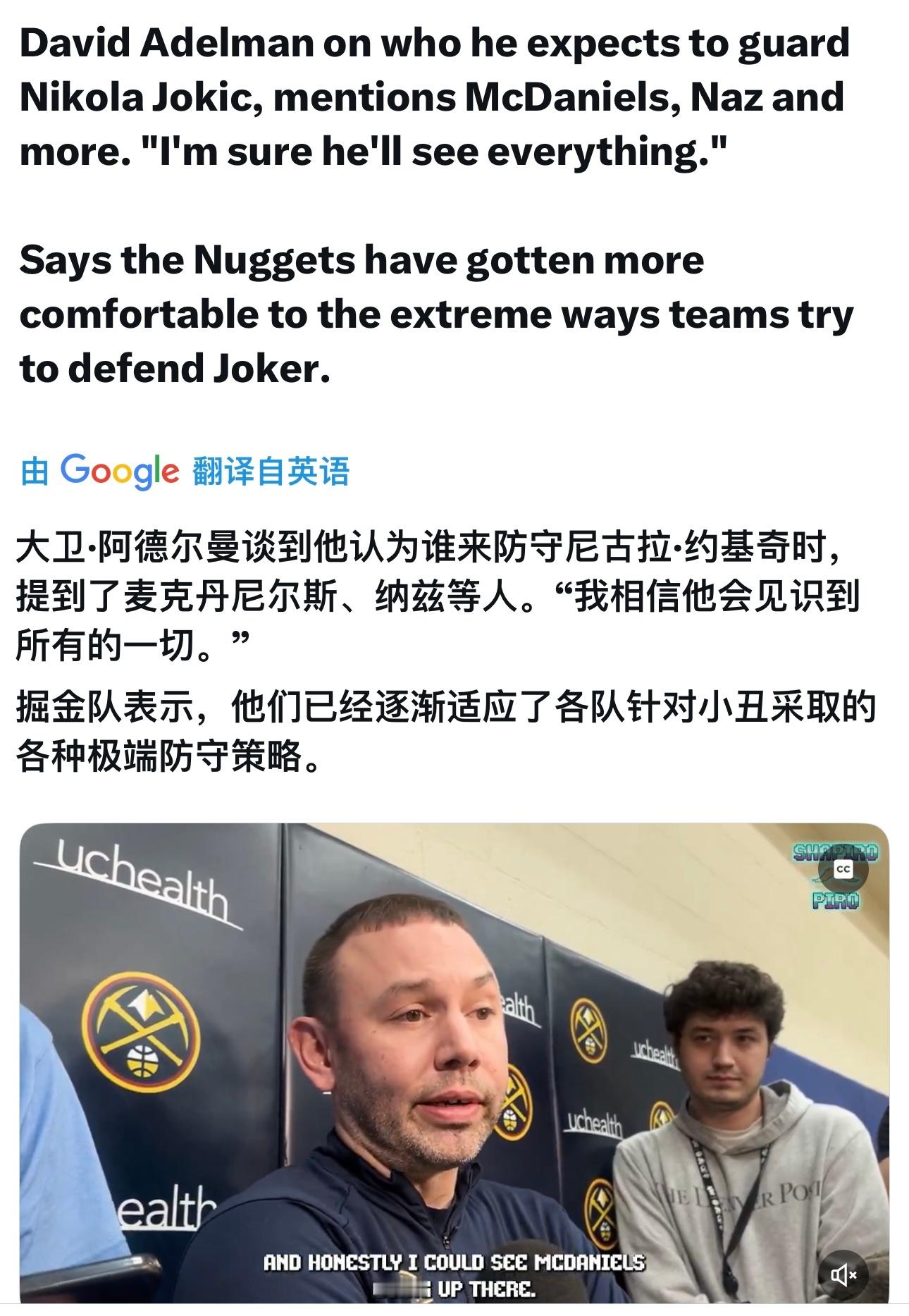 大卫·阿德尔曼谈到谁会去防守尼古拉·约基奇时,提到了麦克丹尼尔斯、纳兹·里德等人。“我确定约基奇会见识到所有的防守方式。”他表示,掘金队已经越来越适应其他球队为限制约基奇而采取的各种极端防守策略。