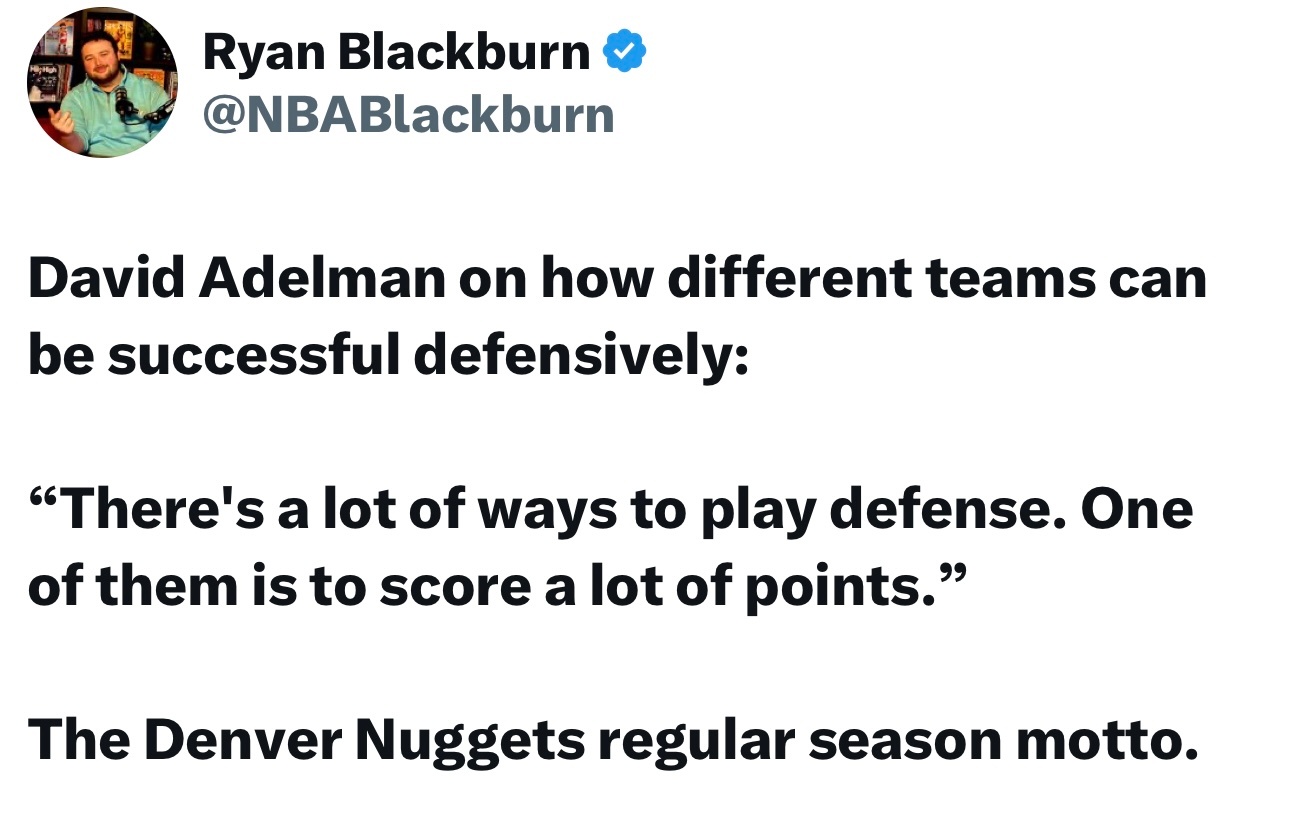 大卫·阿德尔曼谈不同球队如何在防守端取得成功:“防守的方式有很多种,其中一种,就是得很多分。”——这也正是丹佛掘金队常规赛的座右铭。丹佛掘金森林狼vs掘金