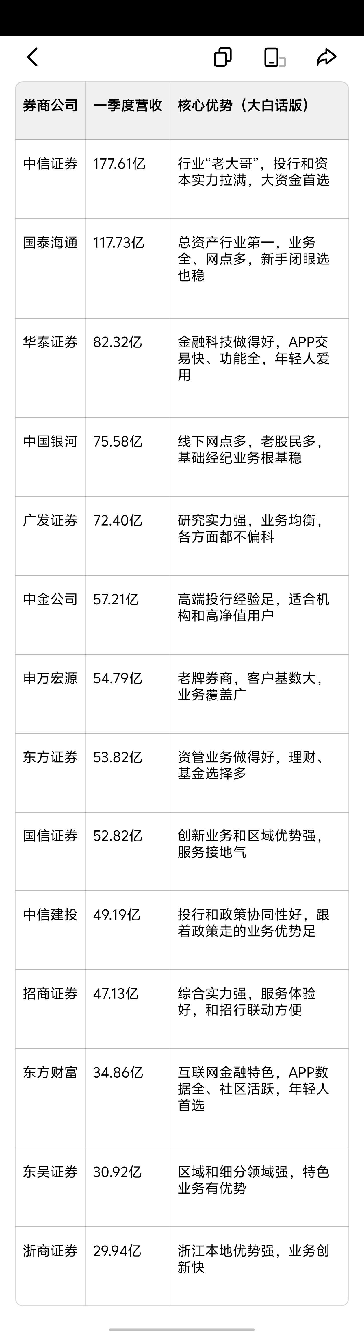 3. 匹配自己的需求:大资金、看重综合实力选中信、国泰;新手、看重体验选华泰、东方财富;线下业务多的选银河、招商。