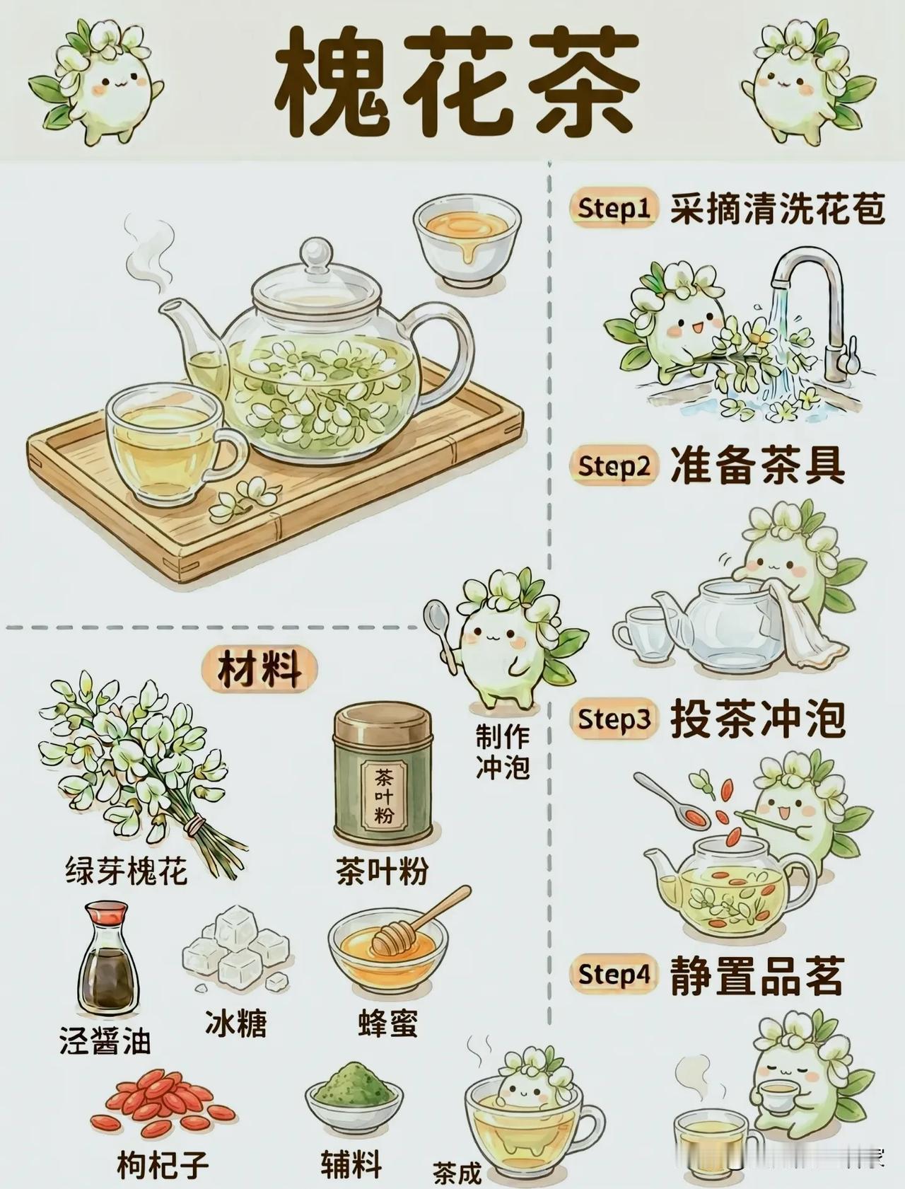 🍵 嫌麻烦的话,晒干了泡成槐花茶,加一勺蜂蜜,清热又解腻,把春天的味道泡进杯子里。