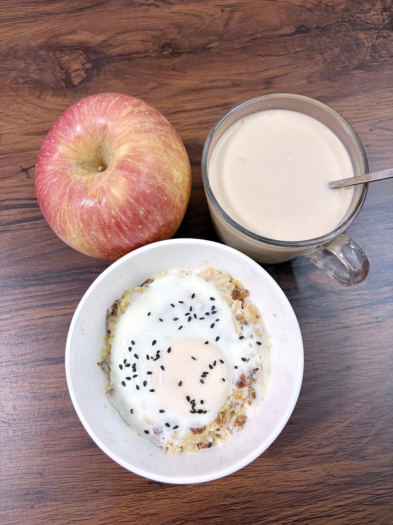今日减脂早餐:燕麦鸡蛋+奶咖+苹果(苹果上午吃)