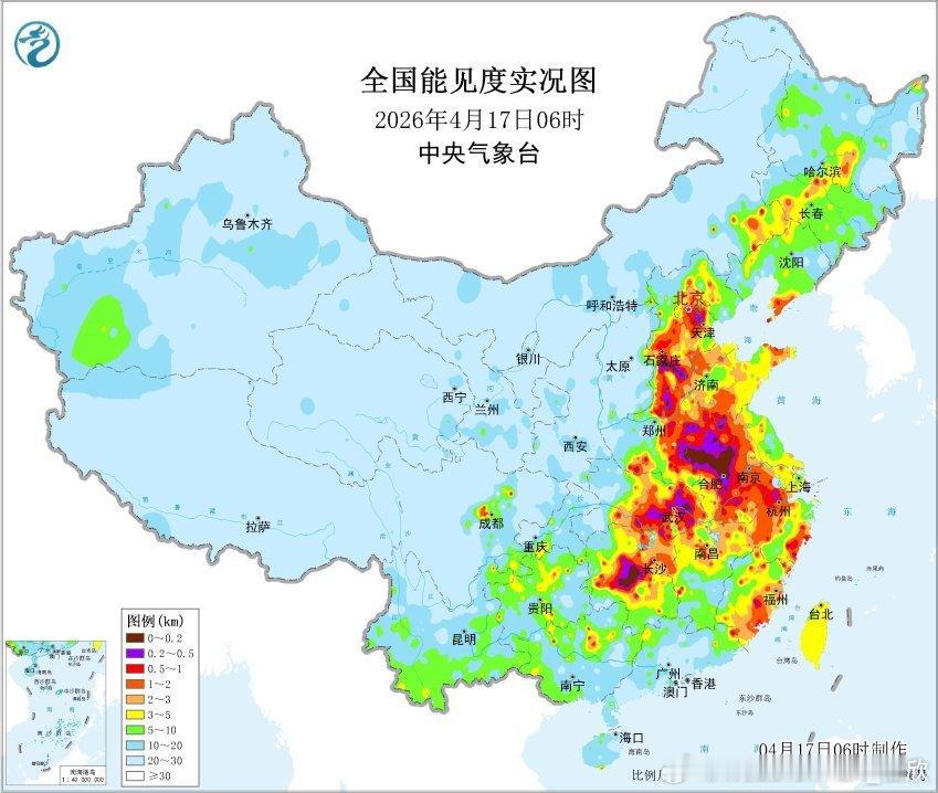 【大雾】今晨从华北到长江中下游多地,雨后湿度大,出现连片的大雾,部分站点出现能见度低于50米的特强浓雾,比如8时能见度,安徽黄山20米、寿县46米、河北蔚县23米。8时能见度较低站点还有: