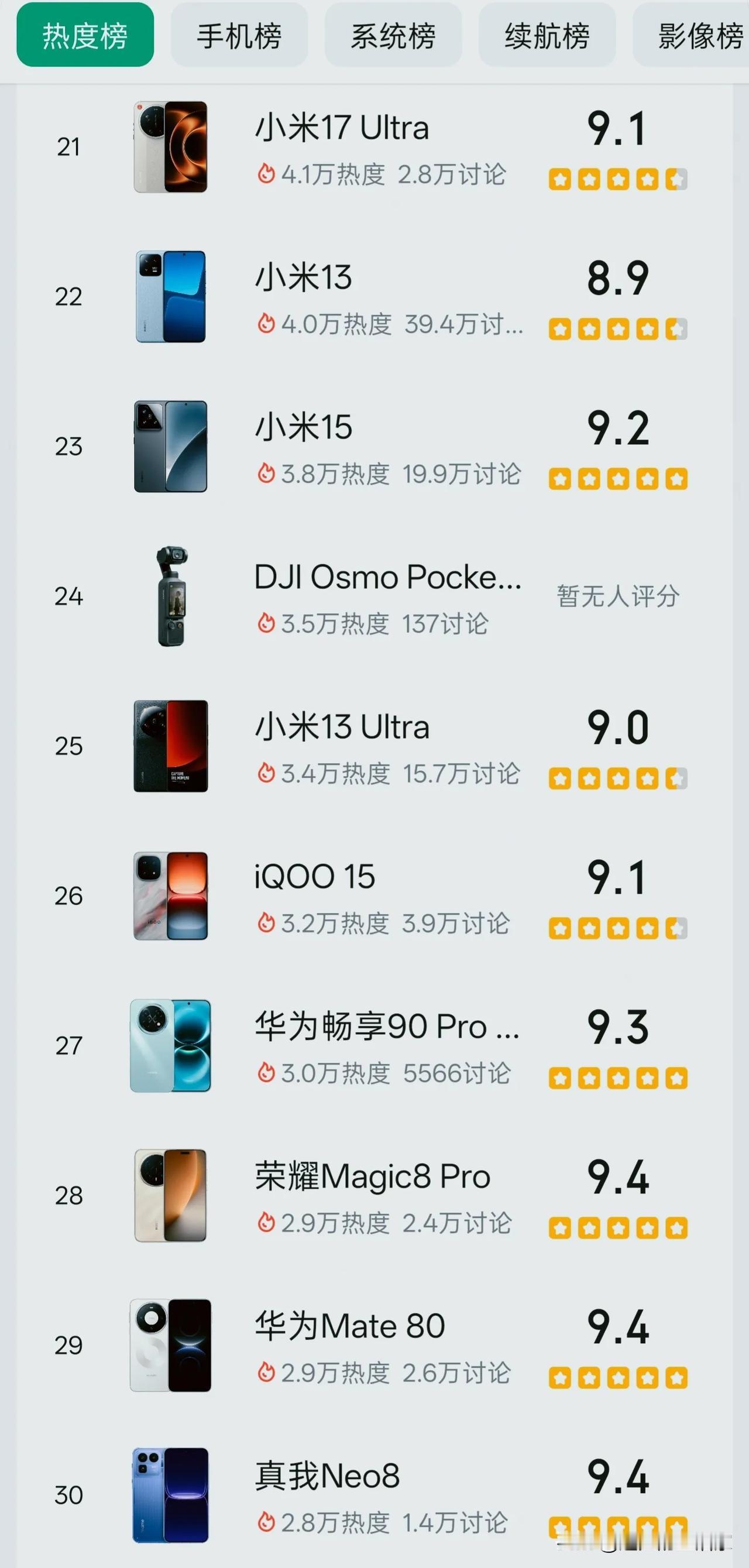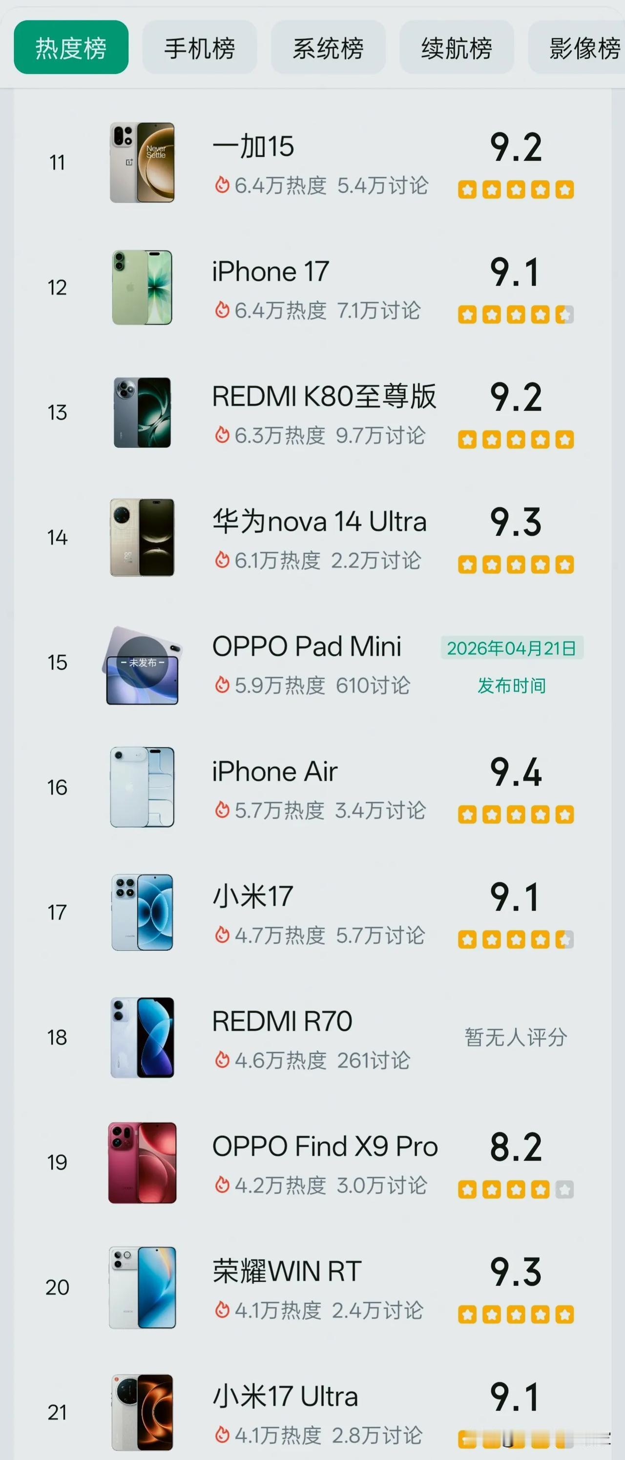 榜单前四名里,有三款都是还没发布的机型,OPPO Find X9系列、华为Pura90 Pro、华为Pura X Max,靠着曝光和期待值直接霸榜,热度最高的Find X9系列直接冲到17.4万,讨论量也破了6000+,妥妥的“未发先火”。反观已经发布的机型里,华为Mate 80 Pro、小米17 Pro Max这些旗舰机型,靠着高口碑和9分+的评分稳坐热度榜前列,评论区也是吵翻了天。