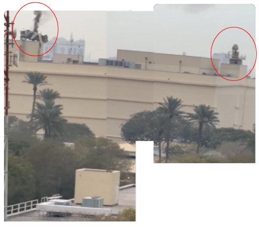 美国驻伊拉克巴格达大使馆的屋顶雷达,上面安装一个防撞铁笼, 以对抗FPV无人机。