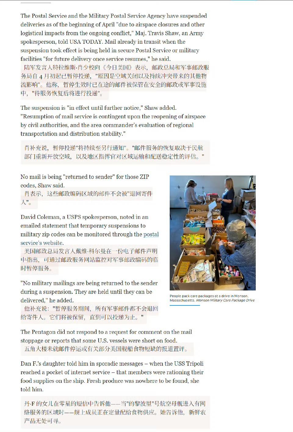自2026年4月起,寄往中东军用邮政编码的邮件无限期暂停,家属花费数千美元准备的关怀包裹(含食品、维生素、日用品等)无法送达,进一步加剧物资与心理压力。