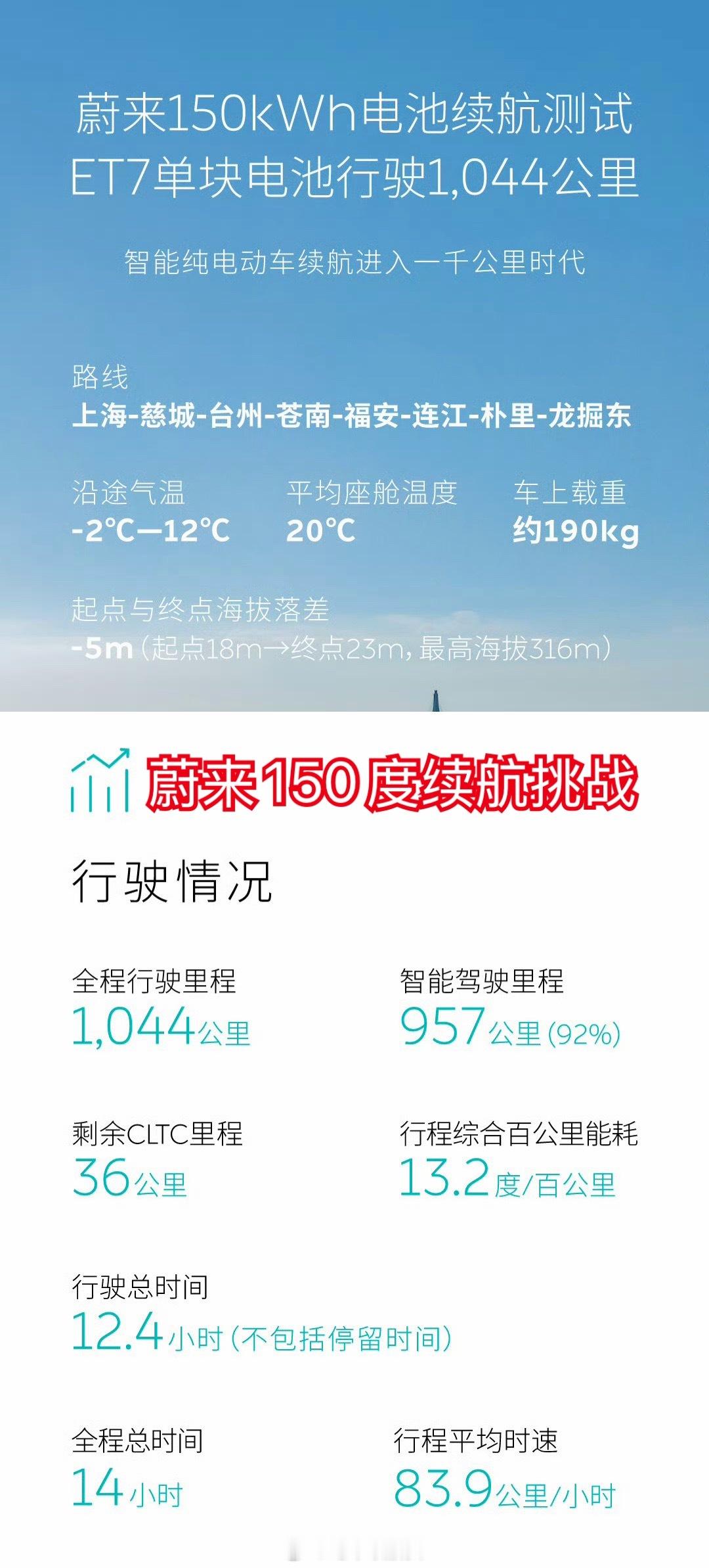 遥想2023年冬季,同样是早上6:30,李斌亲自开着搭载150度固液电池的蔚来ET7,从0度的上海一路开到厦门。全程直播14小时,完成了1044公里的续航挑战(遗憾的是没有展示3分钟又满血1000公里的技能)。