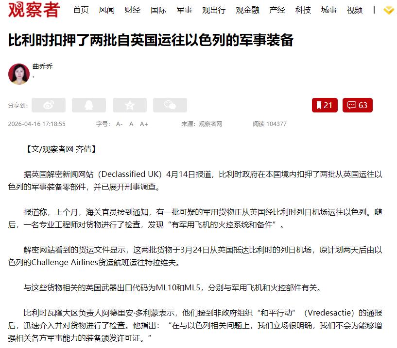跟大家说个实在的国际新闻,比利时在自己国家里,扣了英国要运给以色列的两批军事物资零件,不光扣了,还直接立案查刑事案,一点没给英国和以色列留面子。