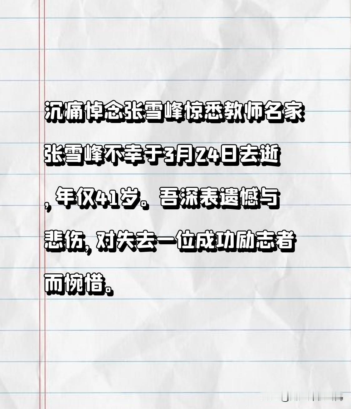 沉痛悼念张雪峰 惊闻教师名家张雪峰于3月24日不幸离世,年仅41岁。我深感遗憾与悲痛,为失去这样一位成功励志者而惋惜。 无论在何种情形下,我都始终觉得张雪峰是正能量的代表,他为人正直、敢言善道且博学多才。