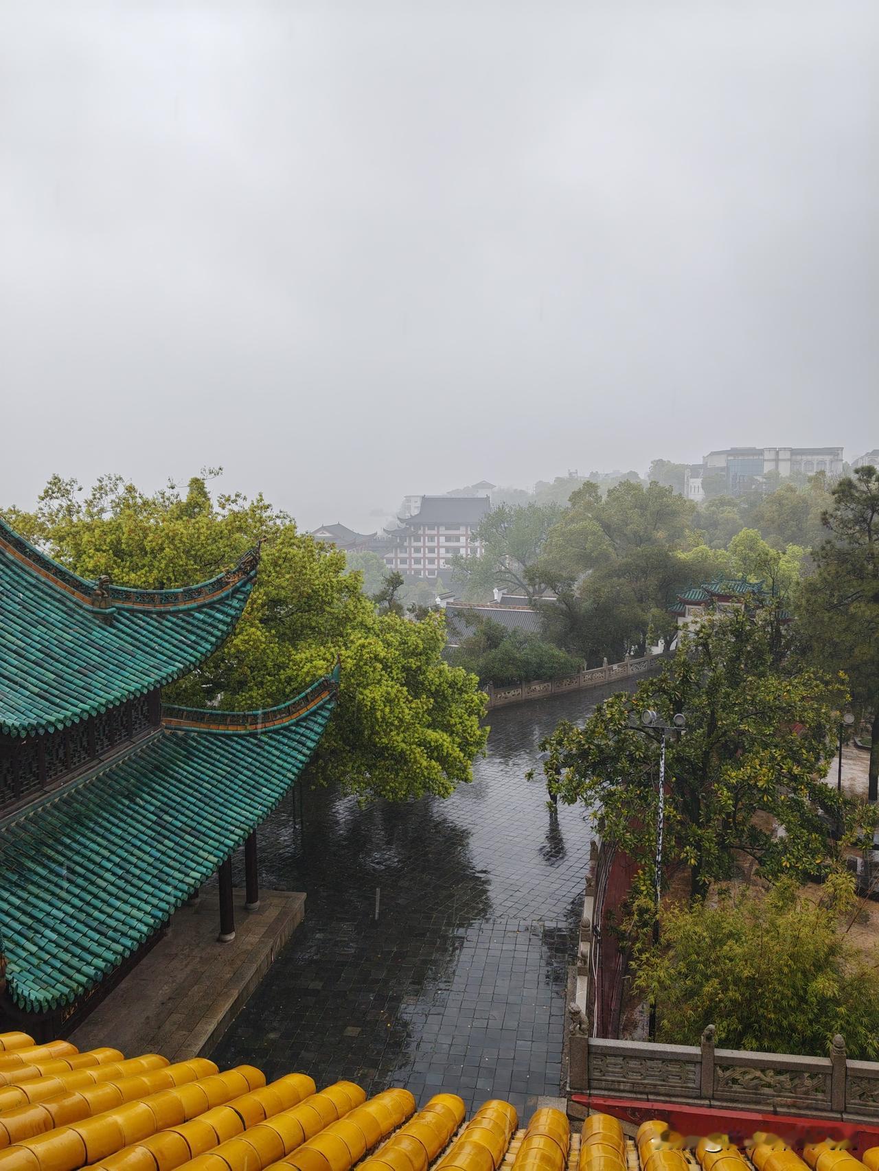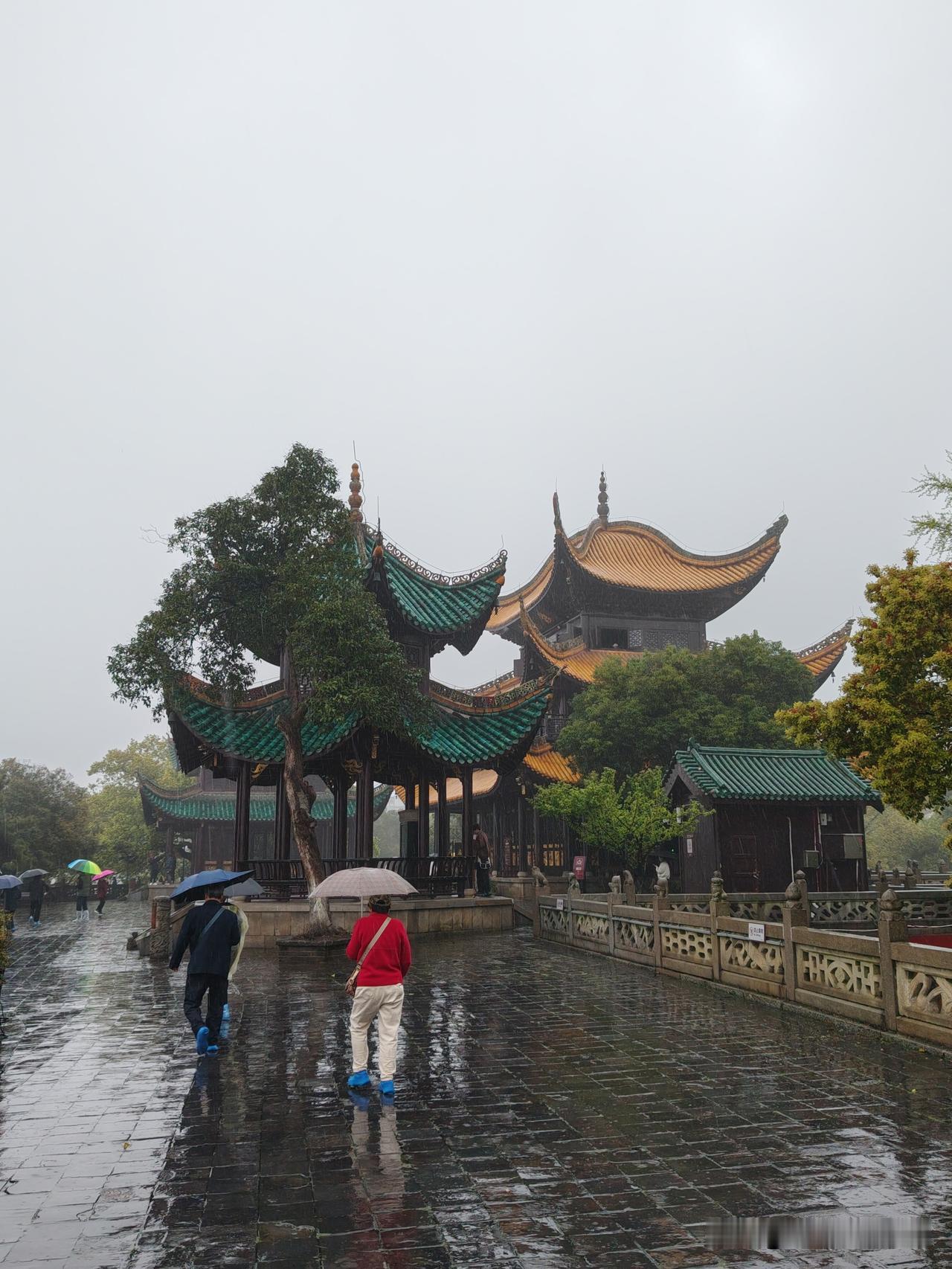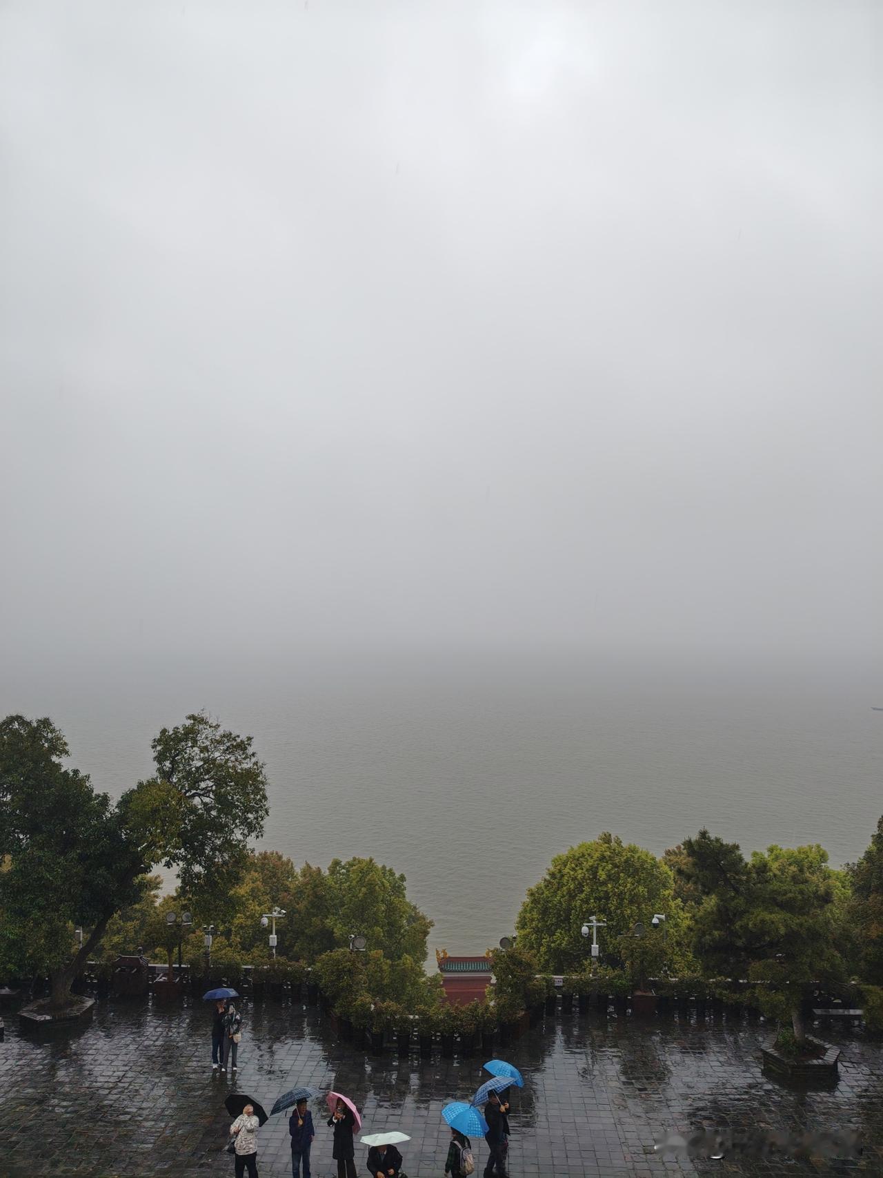 今日,我与爱人冒雨登上了岳阳楼,看到的却是“若夫霪雨霏霏,连月不开,阴风怒号,浊浪排空;日星隐曜,山岳潜形;商旅不行,樯倾楫摧;薄暮冥冥,虎啸猿啼。登斯楼也,则有去国怀乡,忧谗畏讥,满目萧然,感极而悲者矣”的景色,心境也随之起伏。