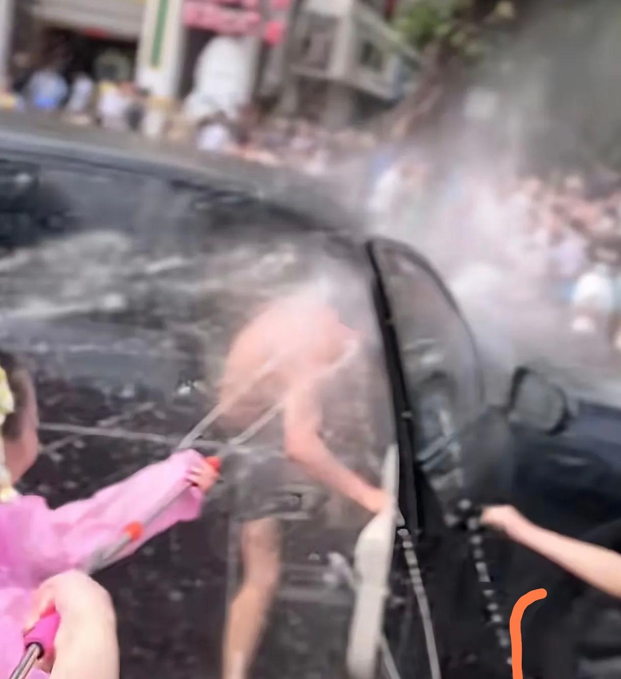 并且还有人非要强行地把别人的车门给扒开,然后往车里面狂泼水,甚至把电车都搞得冒出白烟了。