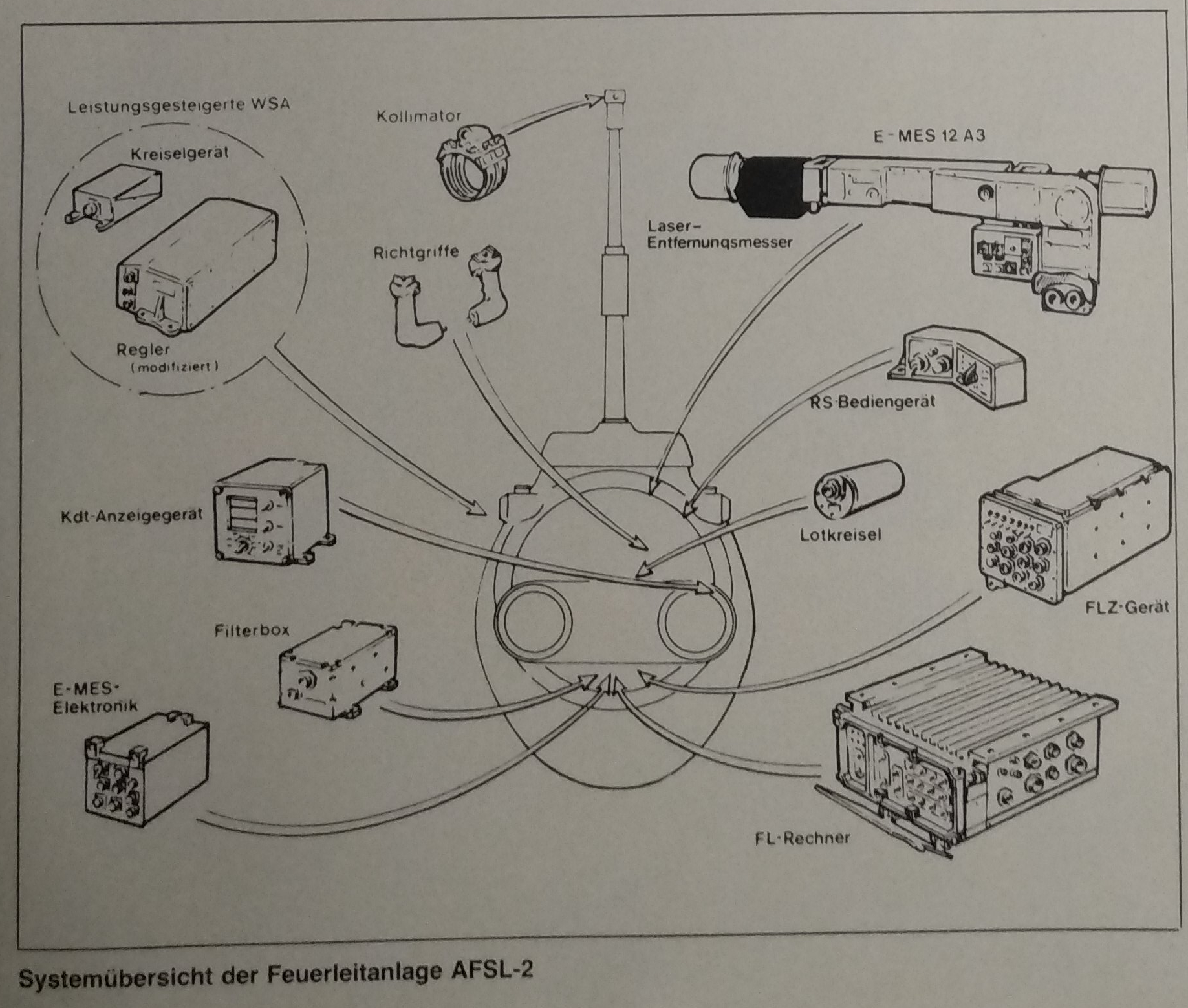在AFSL-2火控系统中组成包括了EMES-12A3瞄准系统、激光测距仪、远程/控制操作单元、垂直陀螺仪、火控辅助设备、火控计算机、EMES瞄准镜电子设备、指挥官显示单元、滤波盒、控制手柄、炮口基准装置、武器稳定系统(WSA)。
