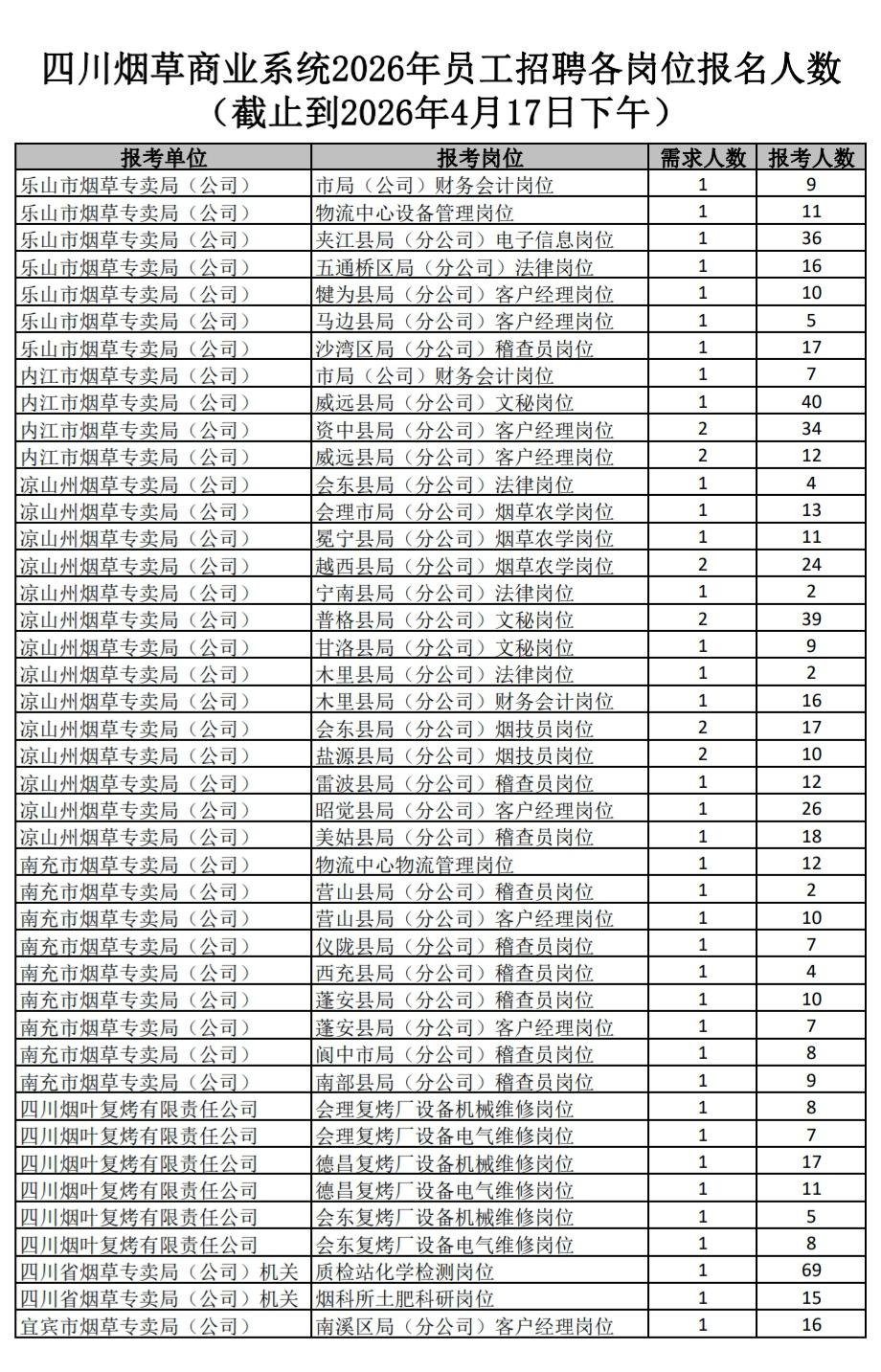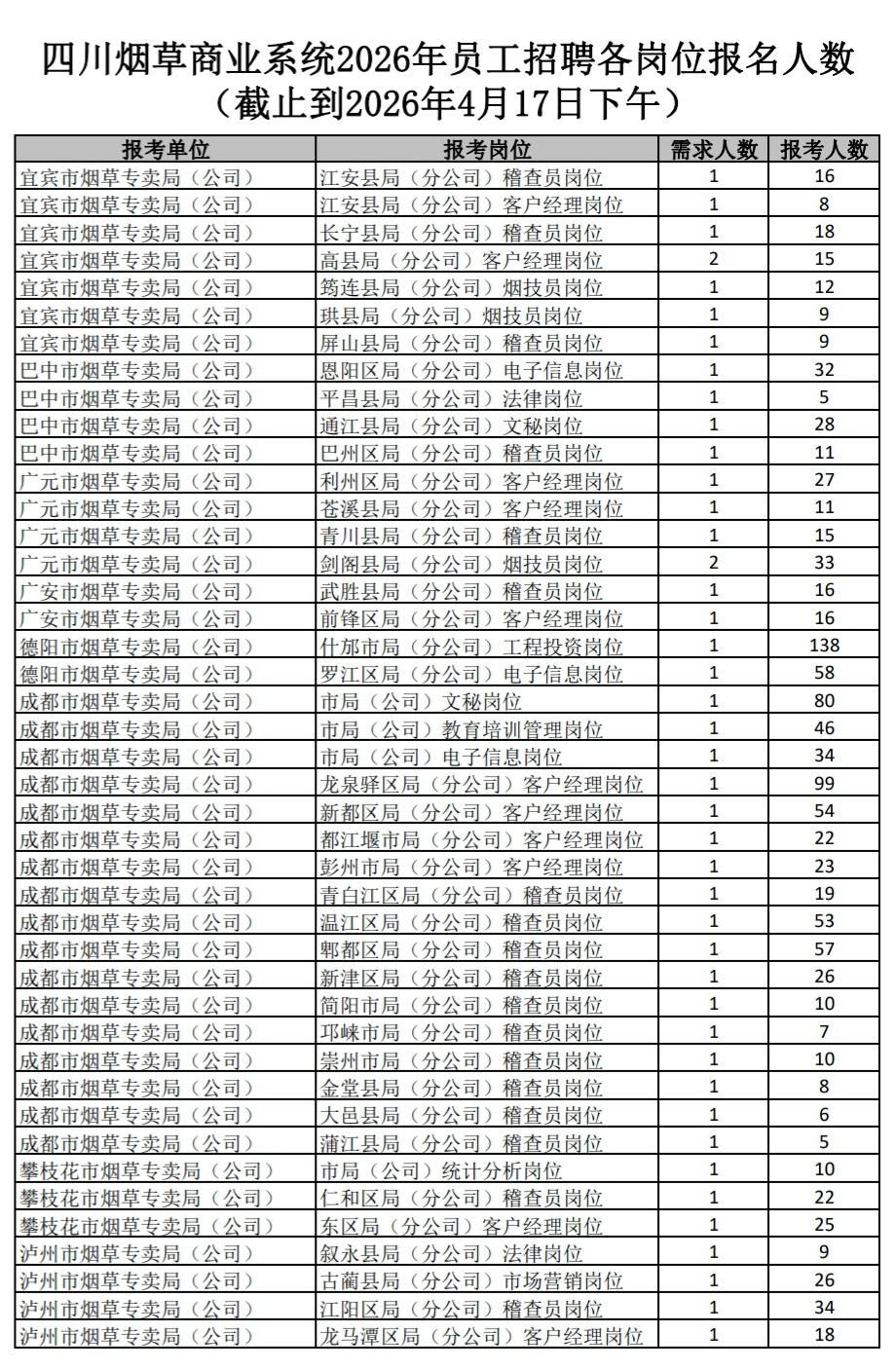 快讯:2026年四川烟草商业报名人数统计公布! 今天是报名第一天,截止到下午已报名2242人,竞争百余个岗位!面向本科及以上应届生,2年择业期可报。 报名截止时间:4月24日17:00 (附图:截止到2026年4月17日下午各岗位报名人数)