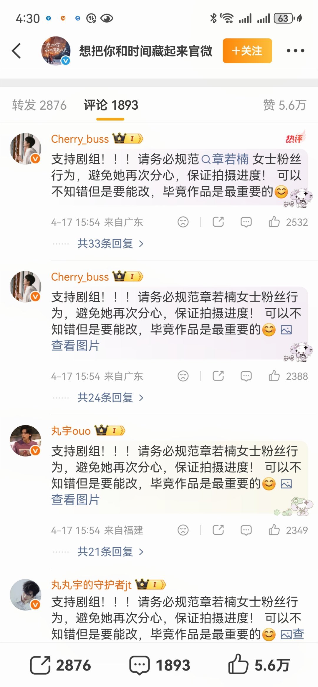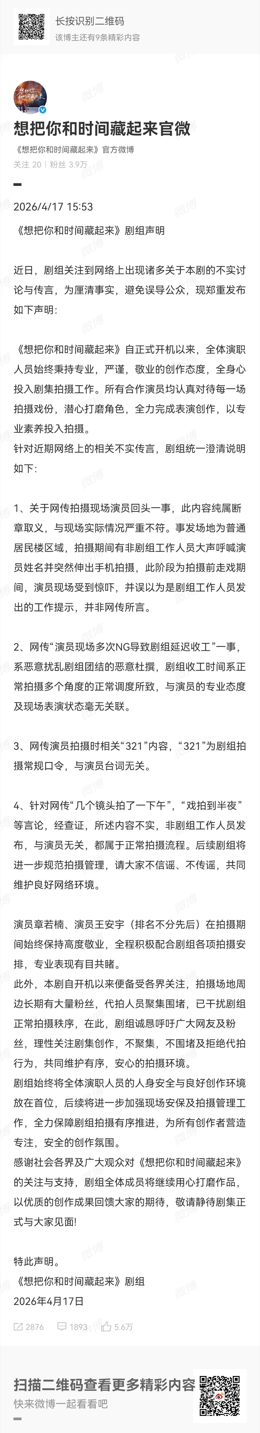 《想把你和时间藏起来》剧组及章若楠工作室已联合发布声明,辟谣章若楠多次NG、拖延收工等不实传言,明确其拍摄态度专业、现场状态良好。目前工作室已对造谣内容全面取证,将依法追究侵权责任。 想把你和时间藏起来剧组声明 章若楠方补充说明