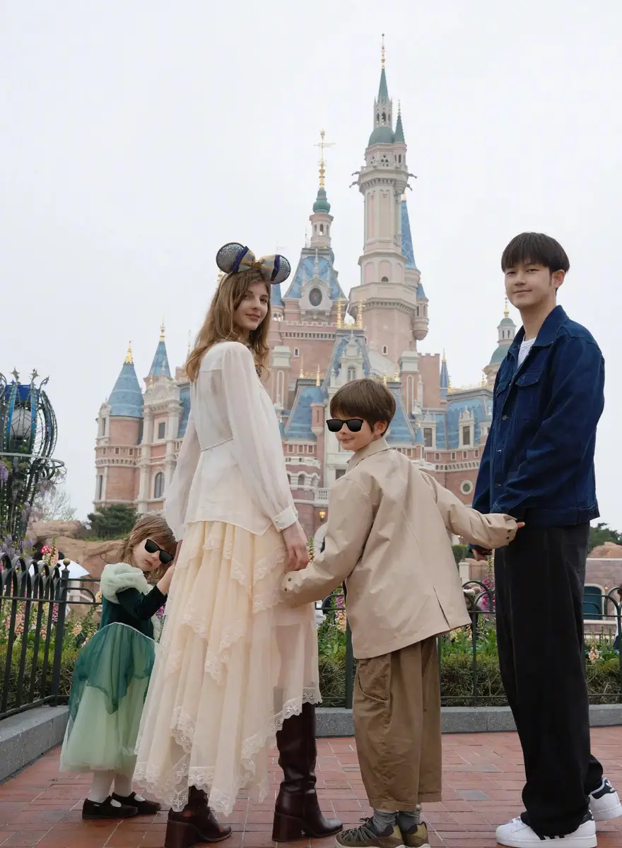 董力分享一家四口城堡前合照 8岁儿子身高引关注