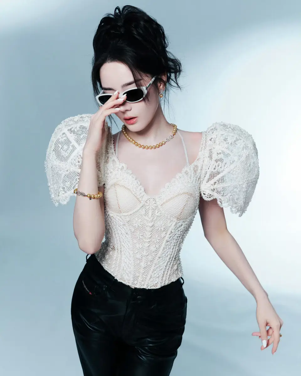迪丽热巴廓形蕾丝胸衣搭配皮裤 甜酷兼具气场全开