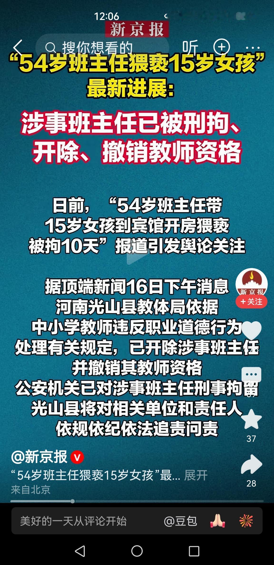 班主任猥亵15岁女生,把孩子逼得重度抑郁,这不是师德失范的违纪问题,这是严重的违法问题。