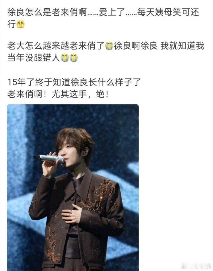 徐良不是老来俏是一直俏 徐良白月光归来的杀伤力我宣布:徐良是内娱唯一一个“冻龄嗓”+“冻龄颜”。演唱会现场和年少的自己隔空对唱《犯贱》,熟悉的旋律、熟悉的嗓音,瞬间梦回那个MP3年代。不是老来俏,是一直俏、永远俏!白月光归来,我甘愿被刀