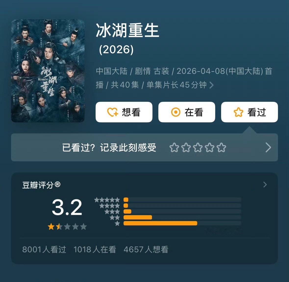冰湖重生豆瓣开分3.2上次评分这么低的还是我的人间烟火2.7东八区的先生们2.1十年前的幻城评分都有3.9