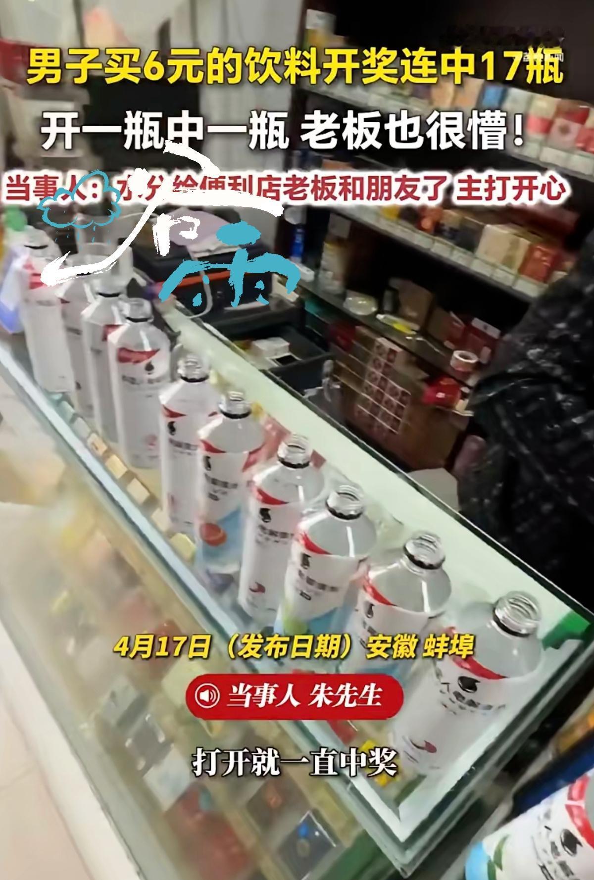 安徽蚌埠这位大哥,本来只是口渴随手买瓶水,没想到一开盖就停不下来,一瓶接一瓶全是“再来一瓶”,把便利店老板都看呆了,直呼从业多年从没见过这场面。