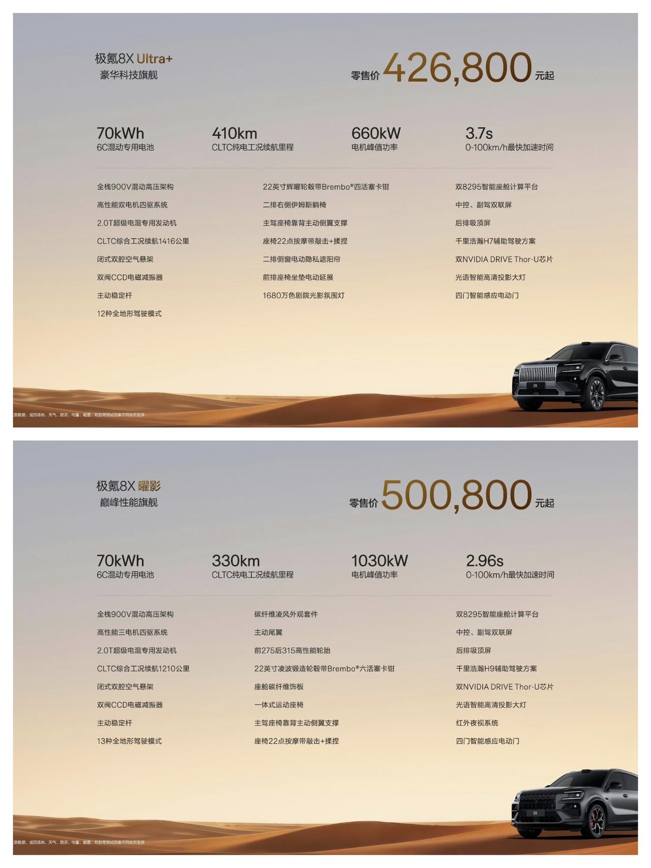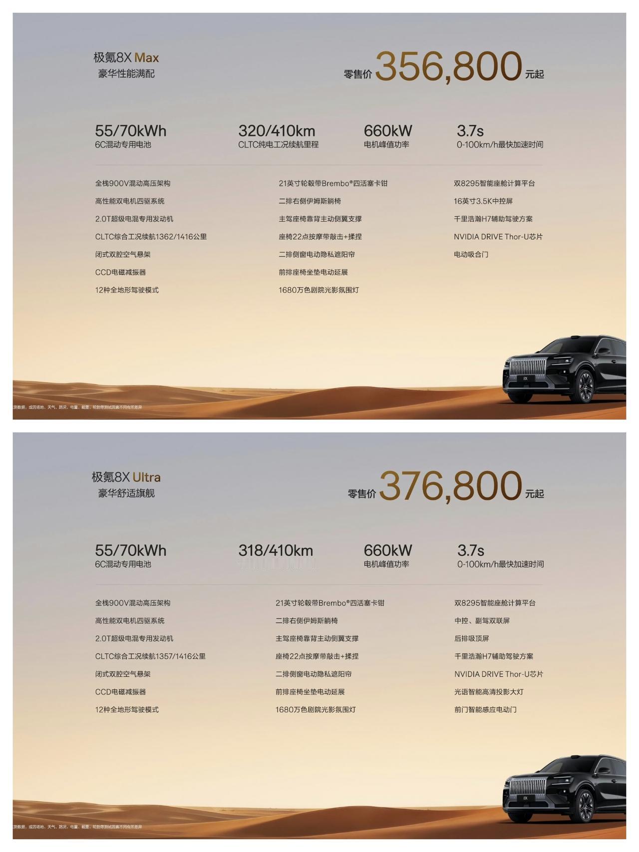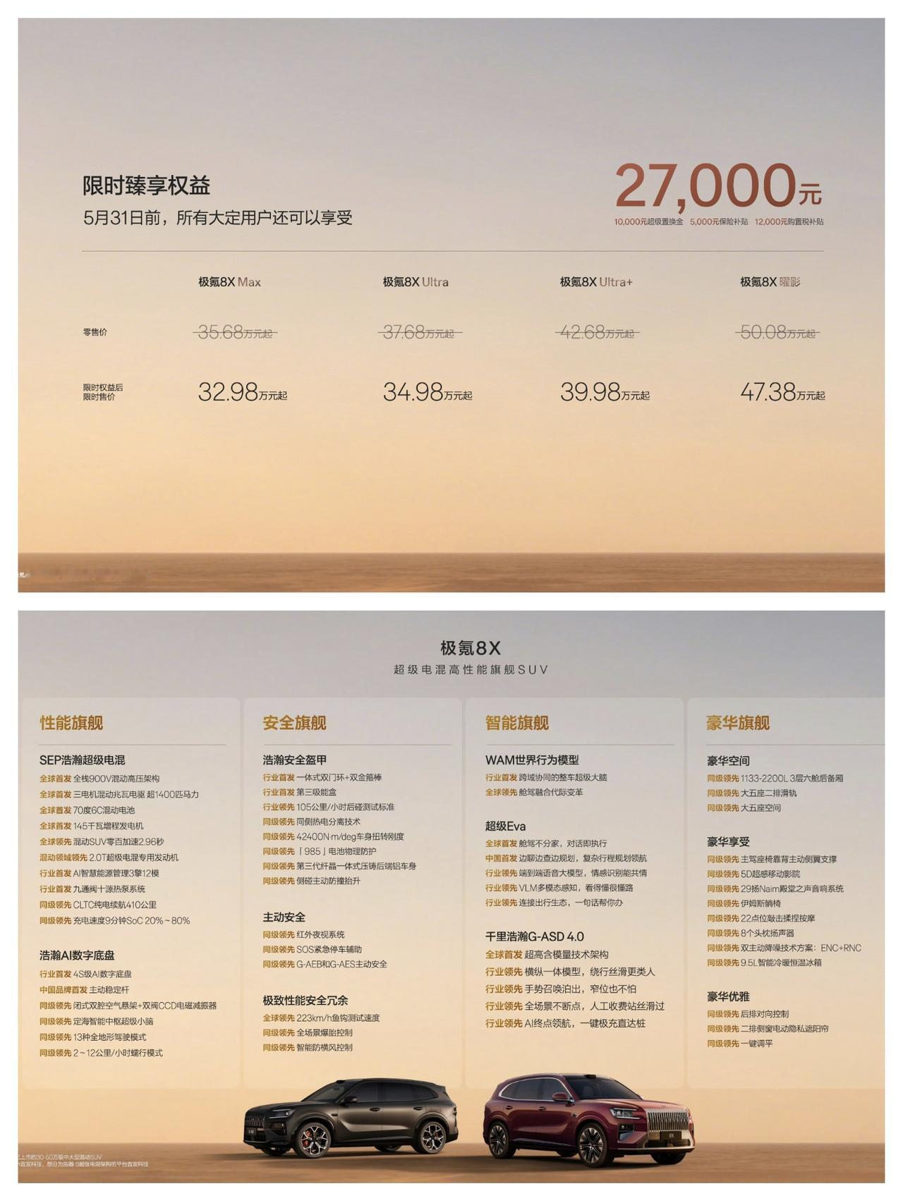 极氪8X价格公布,上市价35.68万元起,限时臻享权益27000元,售价32.98万元至47.38万元。