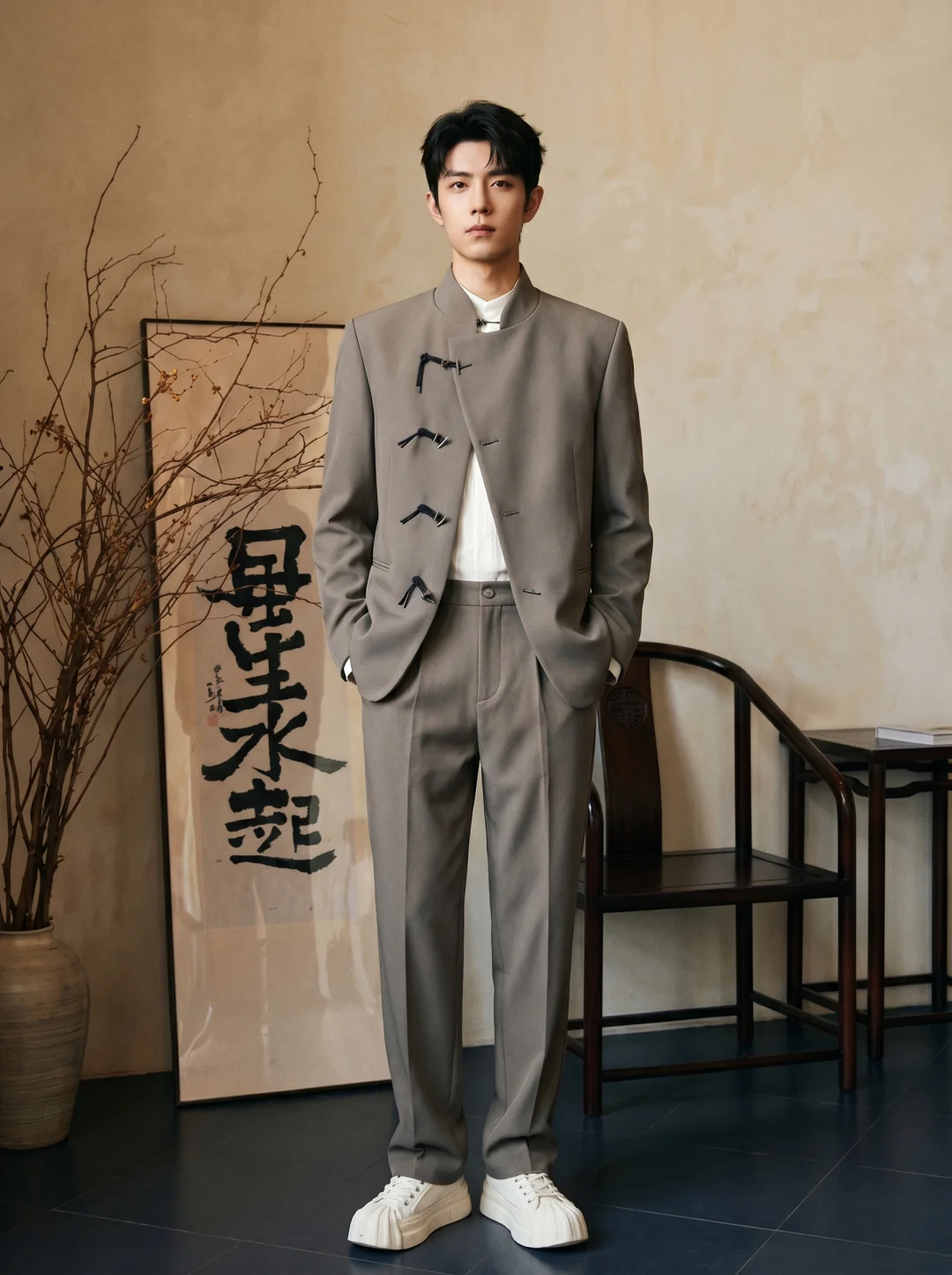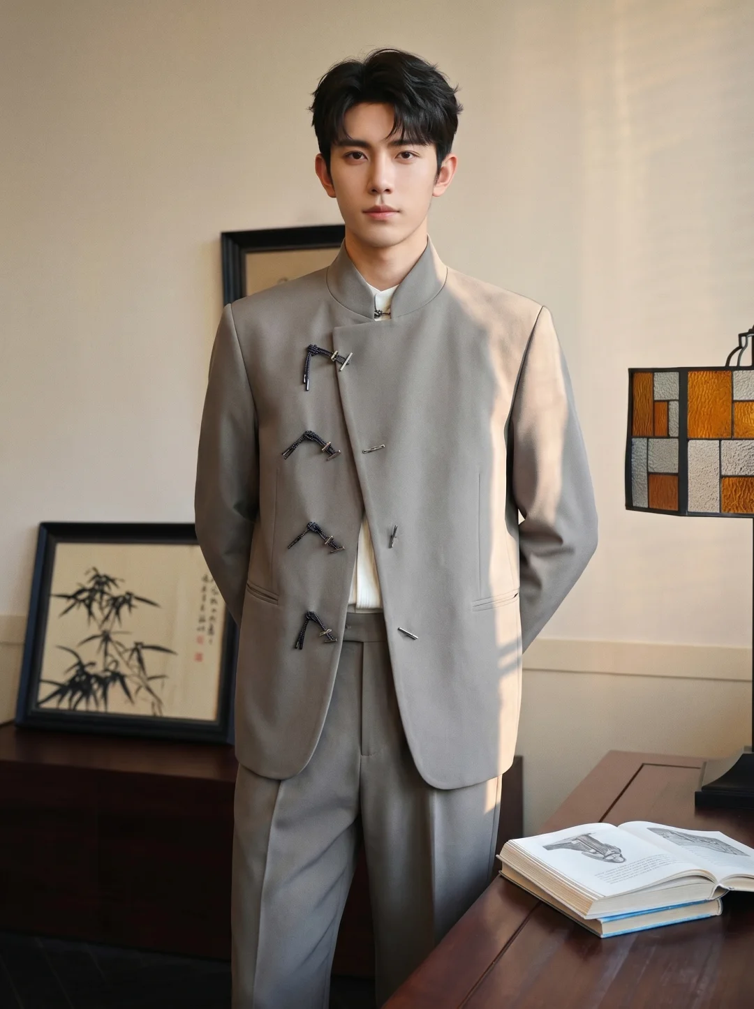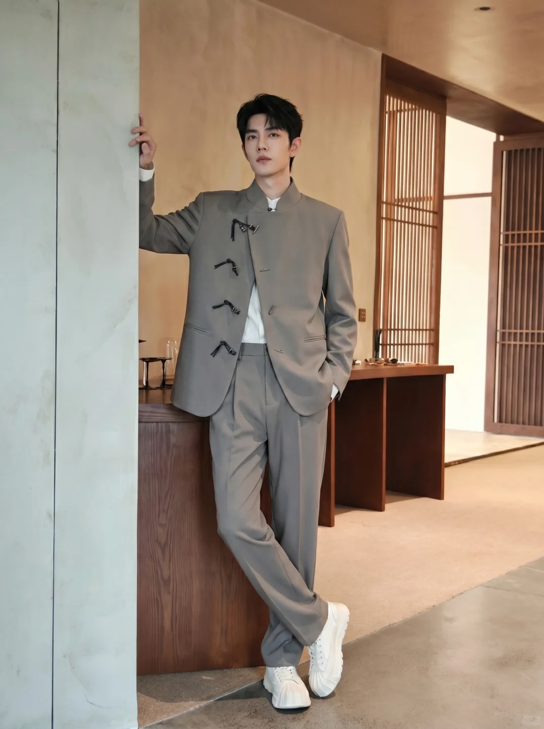 如果订婚宴只能选一套衣服,那一定是“新中式”比起西装革履的商务感,这套中式立领更像是一种中式浪漫的骨子里透出的郑重。分享这套新中式西服。它不是那种古板的唐装,而是将金属盘那种低饱和度的灰褐色,视觉上极度舒适,给人一种稳重、可靠、很有修养的初印象。一上身“都市智性恋”的氛围感直接拉满。内搭的微皱肌理衬衫,干净的月白色,像是把谦谦君子的温润感穿在了身上。没有多余的修饰,仅仅靠剪裁和面料的质感,就能让丈母娘一眼看中你的踏实与品位,在订婚宴这种需要长时间站立、走动的场合,它比西裤要舒服太多,而且那种走路带风的松弛感,能瞬间化解紧张,让你在双方亲友面前举手投足都尽显大方。