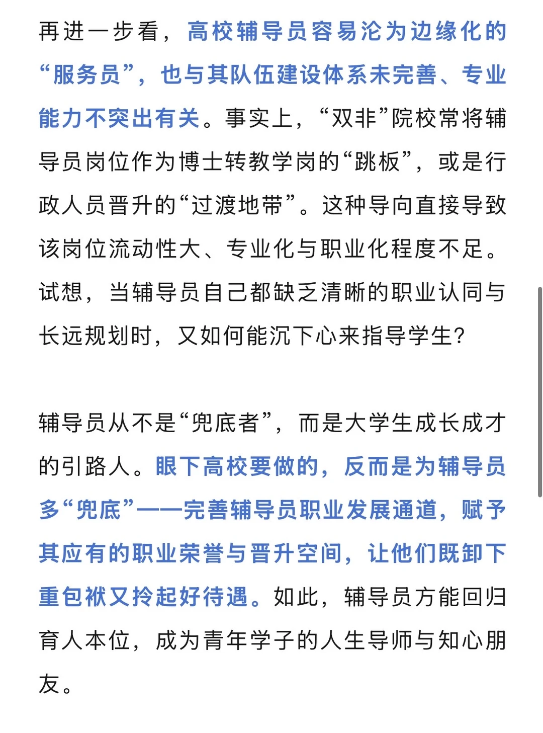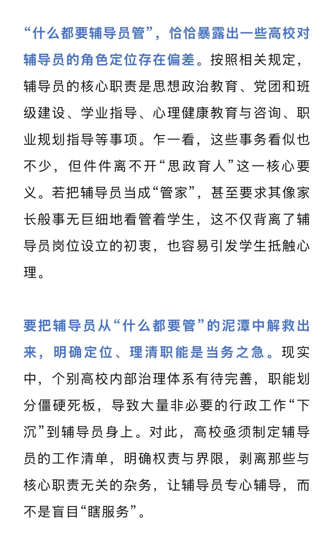 无限责任、万能兜底”“辅导员干成了服务员”……半月谈记者近日在多所高校走访中发现,“担子重”“碎片化”成了辅导员工作的普遍标签。不少高校辅导员直言,“什么都要管”。 “什么都要辅导员管”,表面上看,是因为高校辅导员工作“过载”且边界模糊。往深里看,这更像是对辅导员“什么都要考核”的结果。除了日常工作之外,辅导员还要考核看论文、课时、科研项目等。细化到各项指标,对违纪率、就业率、竞赛获奖数等硬性指标姑且不论,有的高校甚至将考研上线率、四六级通过率也纳入考核范围。但比起这些琐碎的考核指标,更困扰他们的是“无限责任”的隐形压力。有辅导员坦言,学生的安全是悬在头顶的利剑,时刻都要紧绷神经。只要学生出现一点问题,辅导员都要第一时间介入。 “什么都要辅导员管”,恰恰暴露出一些高校对辅导员的角色定位存在偏差。按照相关规定,辅导员的核心职责是思想政治教育、党团和班级建设、学业指导、心理健康教育与咨询、职业规划指导等事项。乍一看,这些事务看似也不少,但件件离不开“思政育人”这一核心要义。若把辅导员当成“管家”,甚至要求其像家长般事无巨细地看管着学生,这不仅背离了辅导员岗位设立的初衷,也容易引发学生抵触心理。