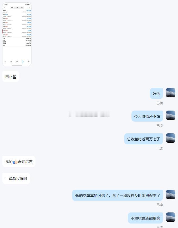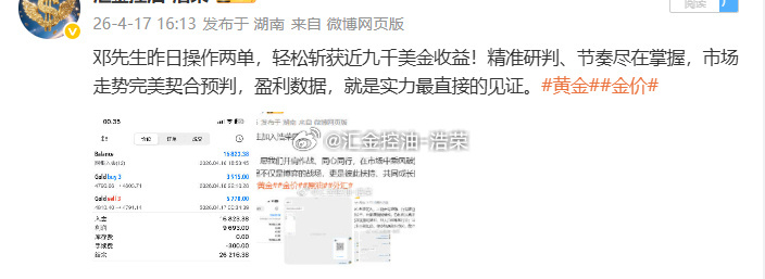 昨日新加入的邓先生,截至目前共操作 6 单,斩获 5 胜 1 平的亮眼战绩,顺利实现翻仓,累计盈利近 2.7 万美金。赚钱本非易事,但选对方向、跟对节奏,一切就会变得简单。你肯信任,我必全力以赴,带你一起把握稳稳的行情,收获实实在在的利润。黄金金价