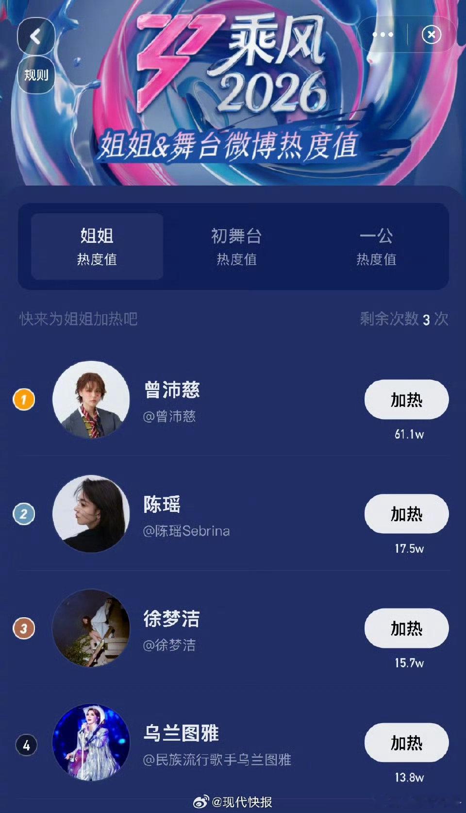 乘风2026一公个人喜爱度前十乘风2026 恭喜冲进前十的姐姐们,舞台上每一秒高
