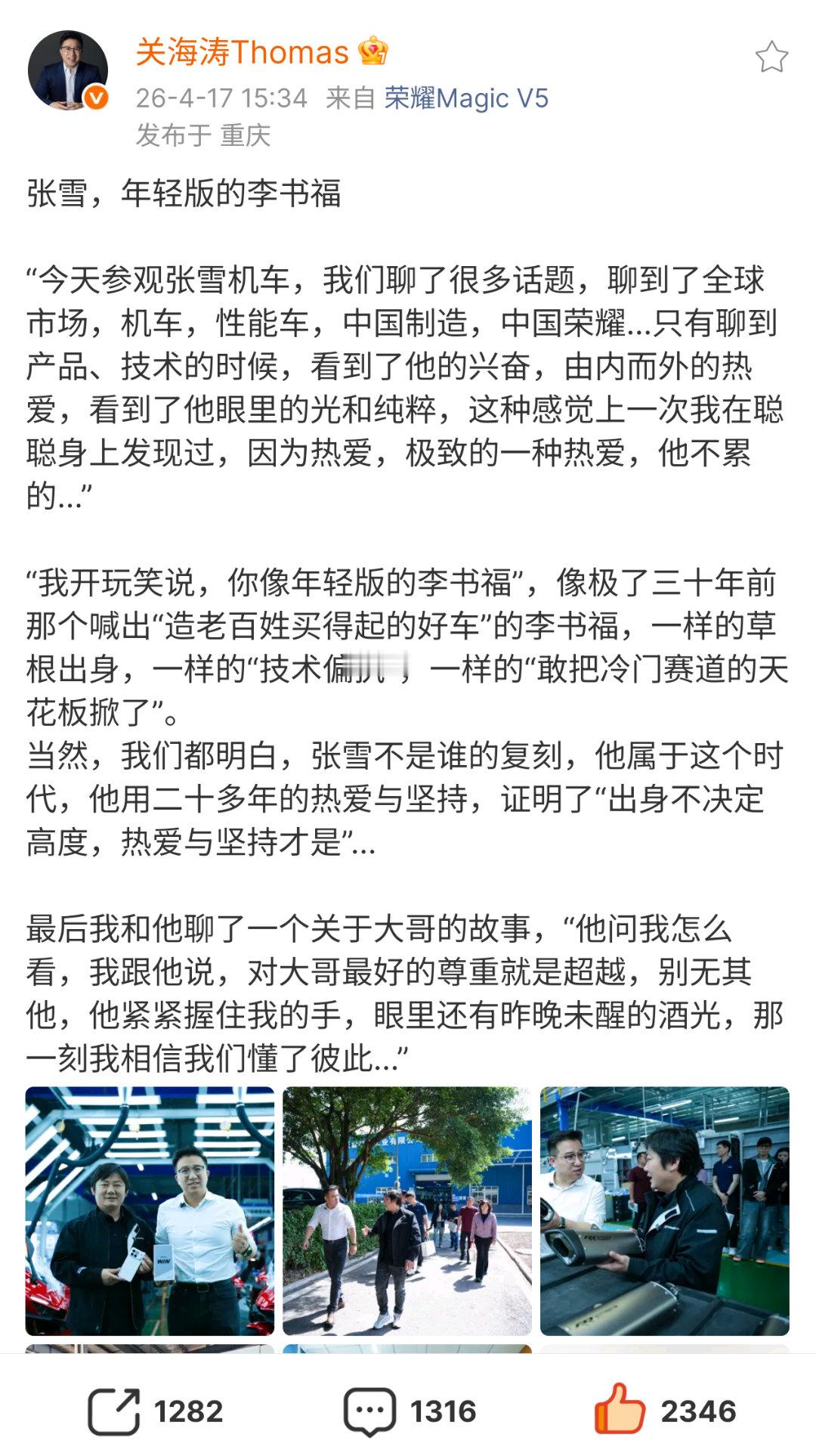 张雪是年轻版的李书福?其实张雪就是他自己,书福董事长也是他自己,只不过他们之间的某种共性,让他们做到了类似的事情。这无疑是我们这个时代的幸运,更是所有追梦人的幸运!