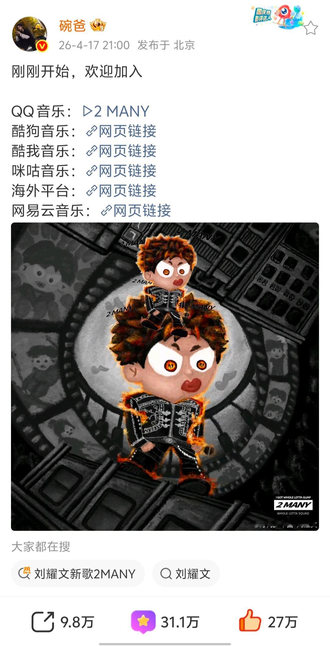 用户18xxx06 2 2026-04-19 03:49 感觉这种流量明星发歌都是差不多的情况,粉丝一天就可以收藏百万,然后估计一辈子都是一百来万了,永远突破不到下一个百万[捂脸哭][捂脸哭][捂脸哭]