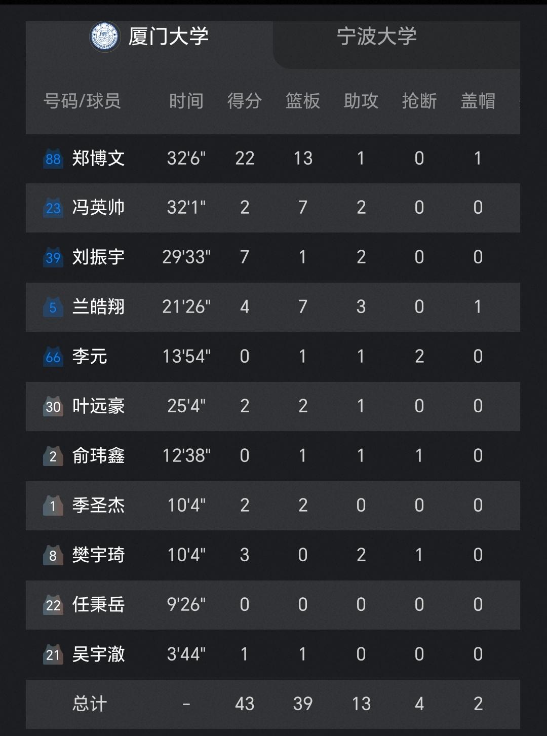 郑博文燃尽获得全队超一半的分数22分,李元有的失准居然0分,冯英帅发挥也不好才2分。宁波大学5号李一帆也很牛获得25分。