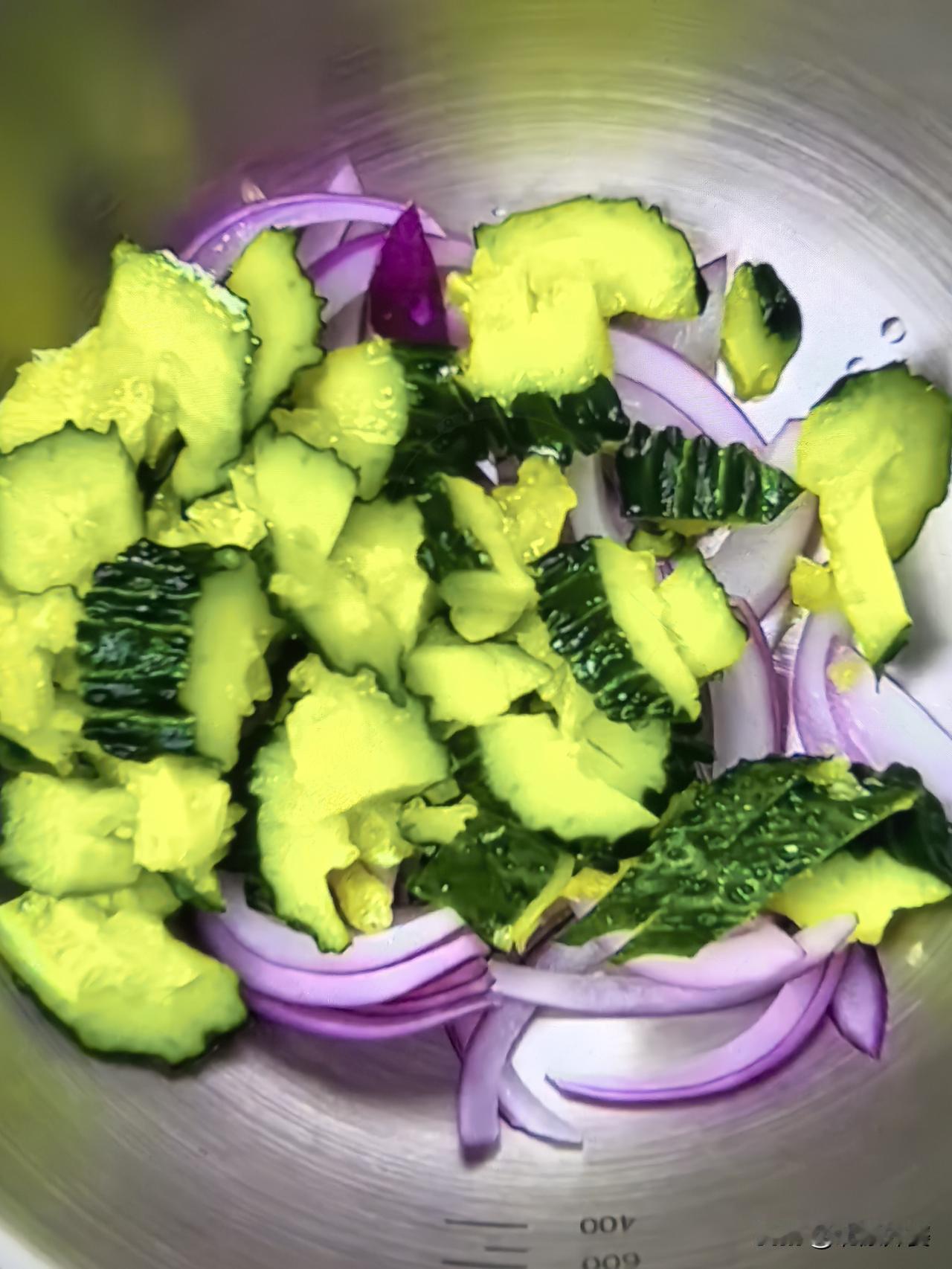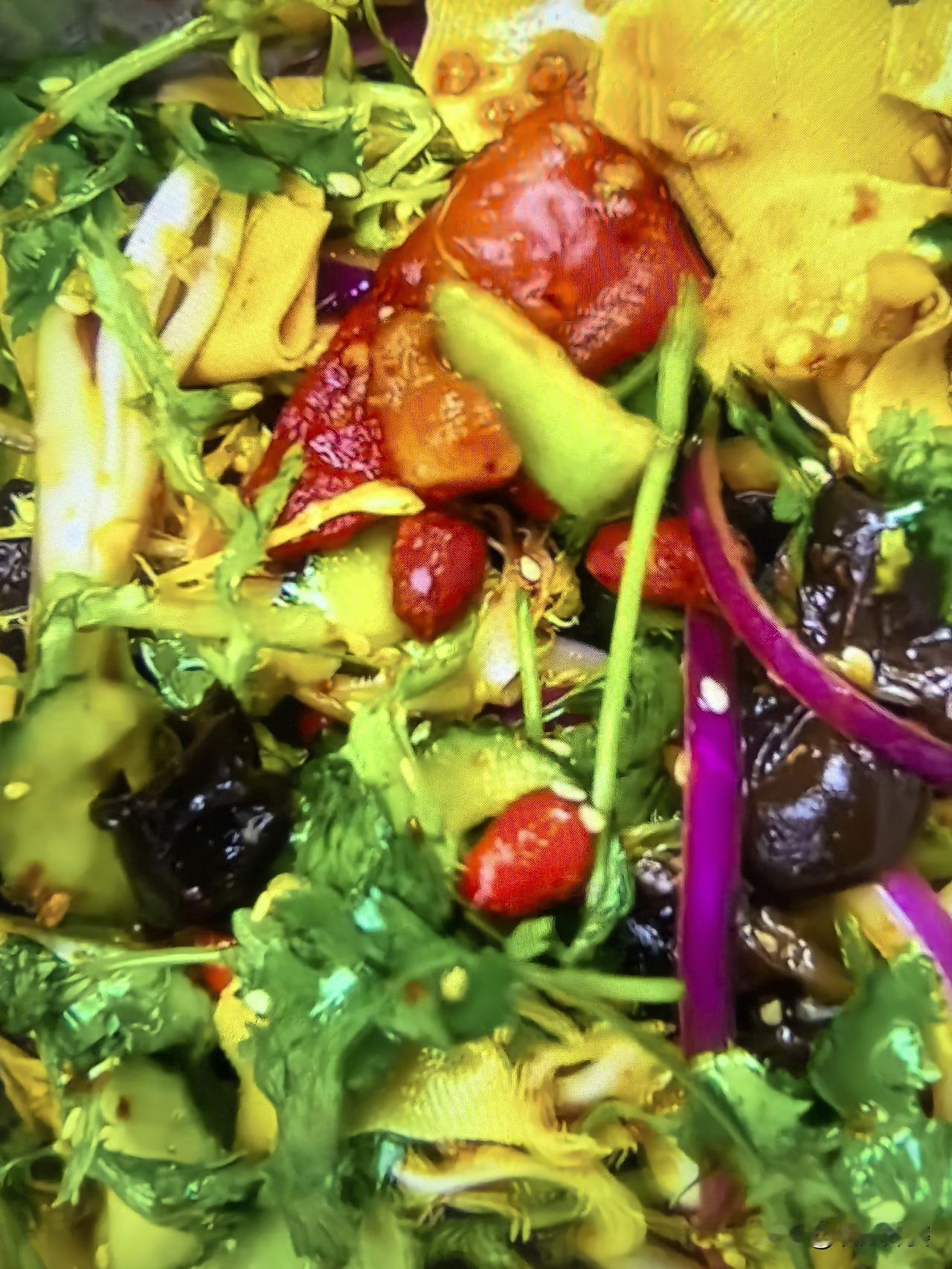 食材:洋葱,黄瓜,豆皮,西红柿,木耳,尖椒,苦菊,香菜,熟花生米