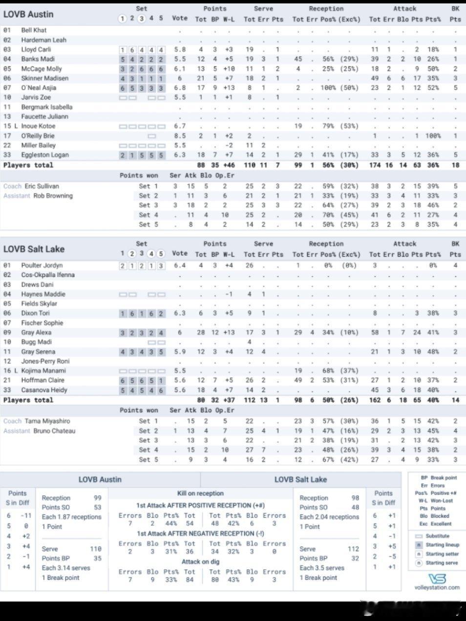盐湖城3-2奥斯汀,加拿大主攻格雷砍下28分帮助盐湖城取胜(58扣24中1失7被拦,3拦1发,29个一传4失,到位率34%,完美率10%)。斯金纳妹妹砍下21分(49扣17中6失6被拦,3拦1发)