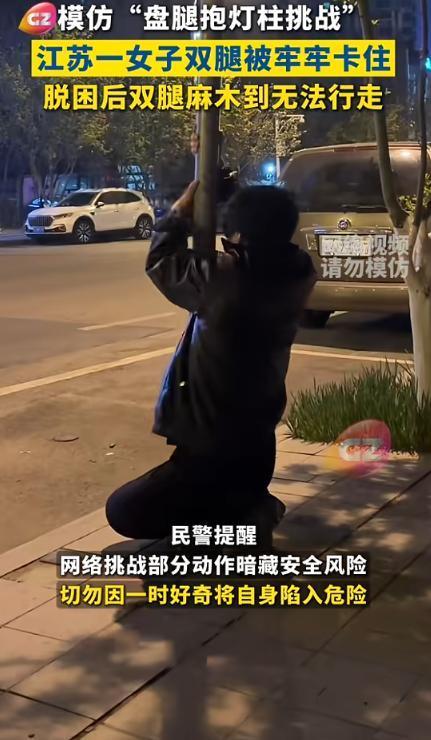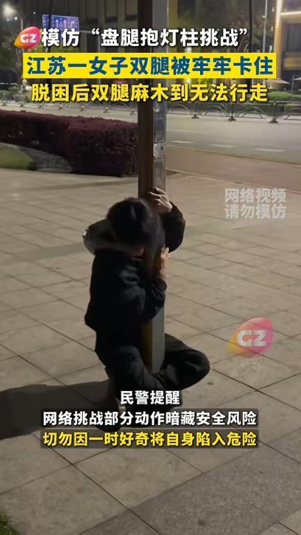 (信息来源:广州ing《江苏一女子模仿网红“盘腿抱灯柱”挑战,双腿被牢牢卡住!脱困后麻木到无法行走,民警提醒:网络挑战部分动作暗藏安全风险,切勿盲目模仿。》)